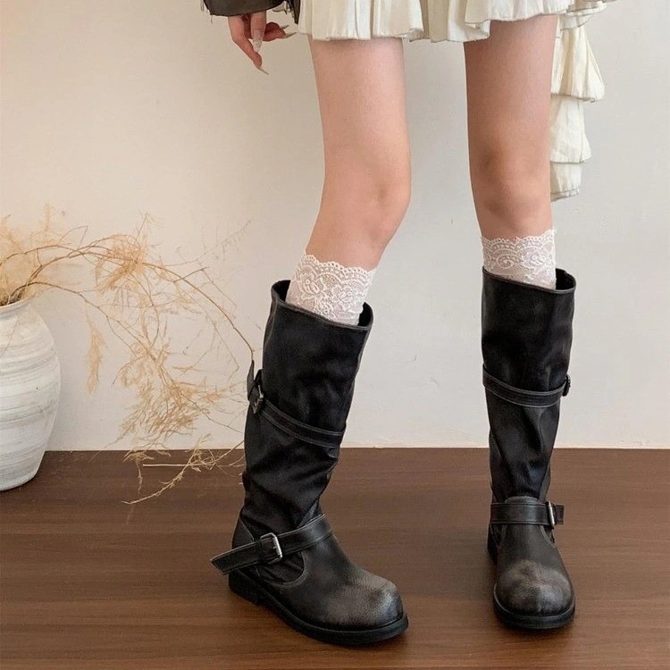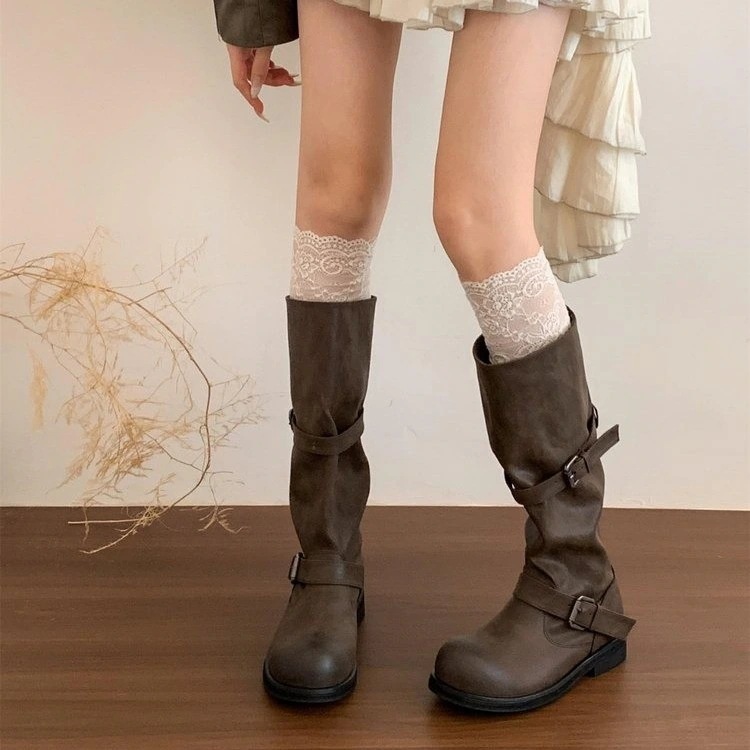 レトロ風スクラッチ加工のロングブーツ女性用太ヒールミドルブーツワークスタイルの膝丈ブーツ