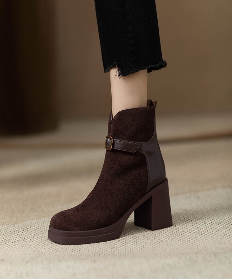 厚底太ヒールパッチワークショートブーツ レディース秋冬新作 バックジッパー マット仕上げ ハイヒールショートブーツ