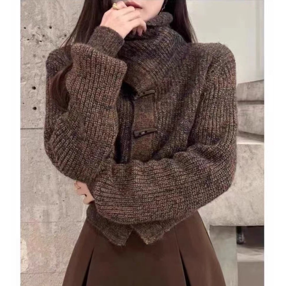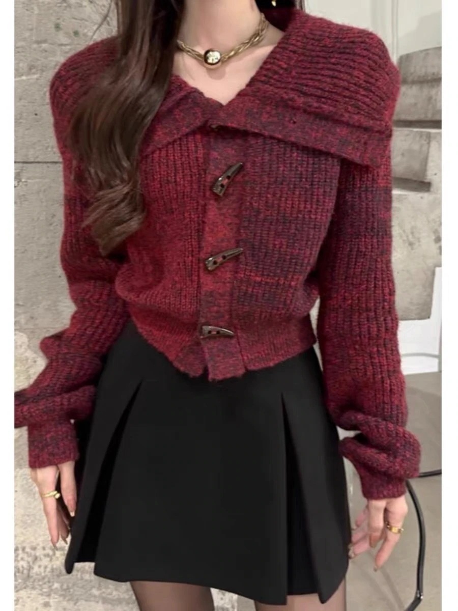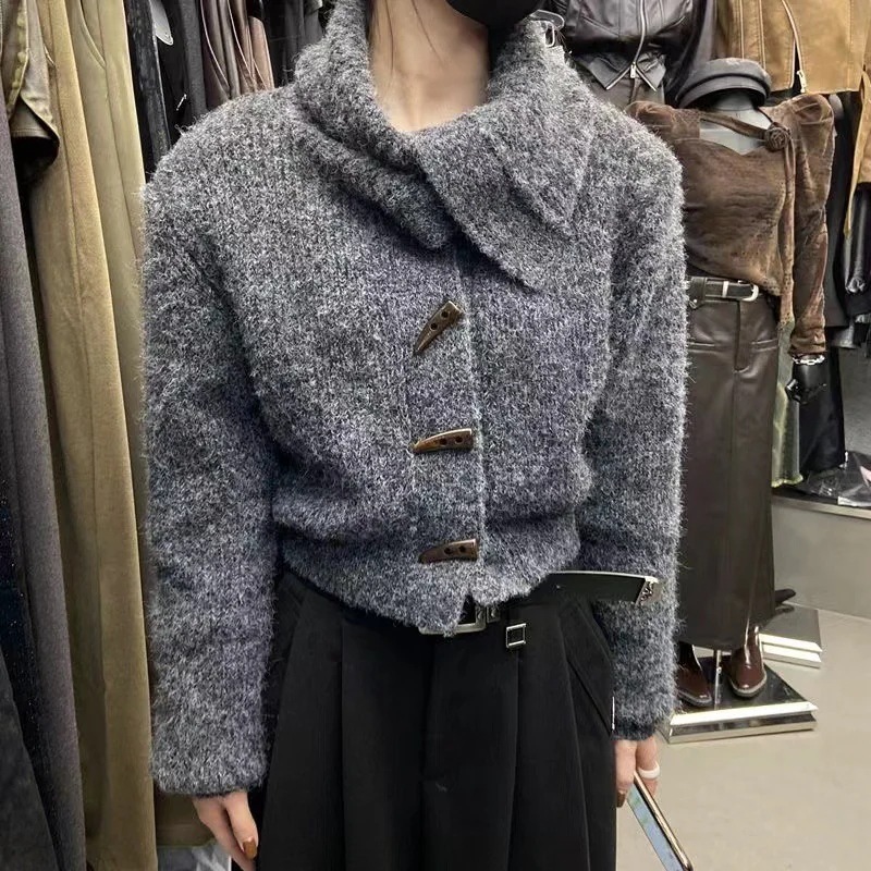 韓国風レディースセーターコート秋冬新作 ゆるい雰囲気 角ボタン付きラペルゆったりショート丈 ニットカーディガン アウター