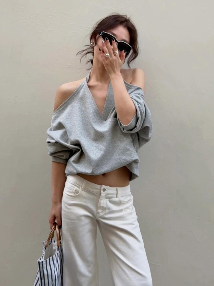 カシュクールカットアウトカットソー オフショルダー トップス レディース 長袖 セクシー Vネック ゆる カットソー 体型カバー 大人カジュアル アメカジコーデ ストリートコーデ 海外コーデ 春 秋