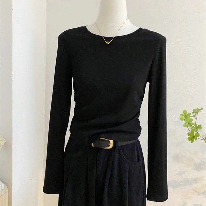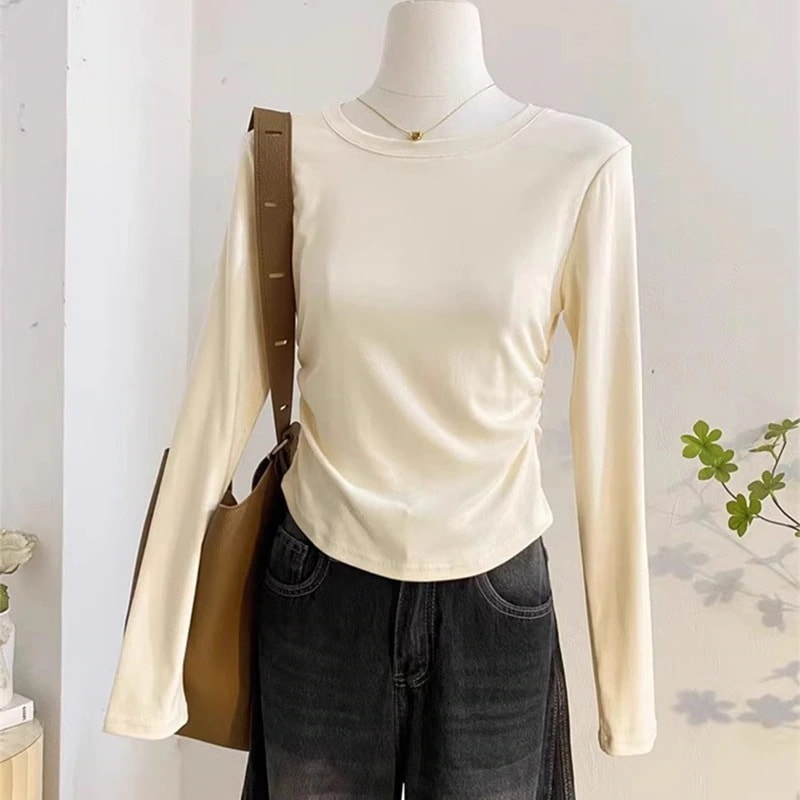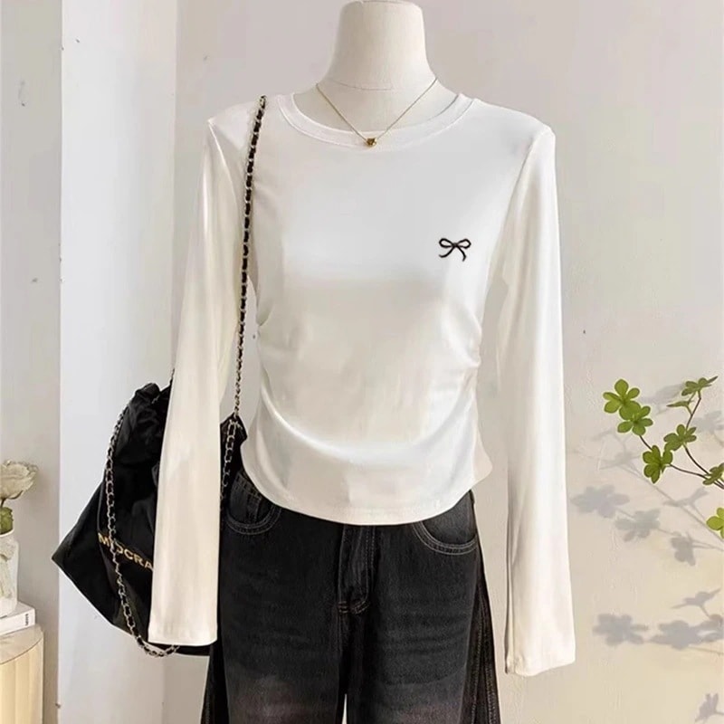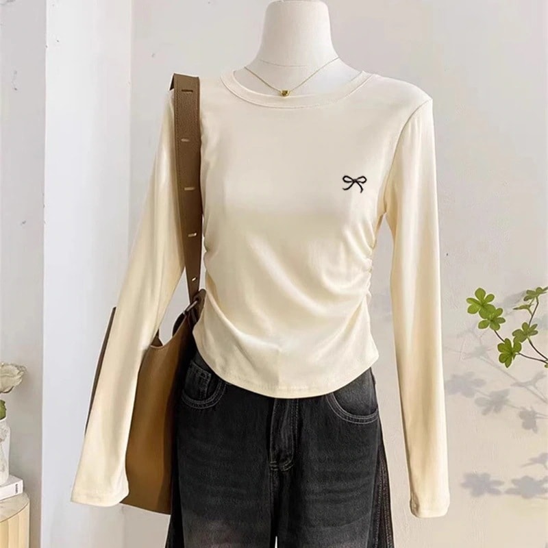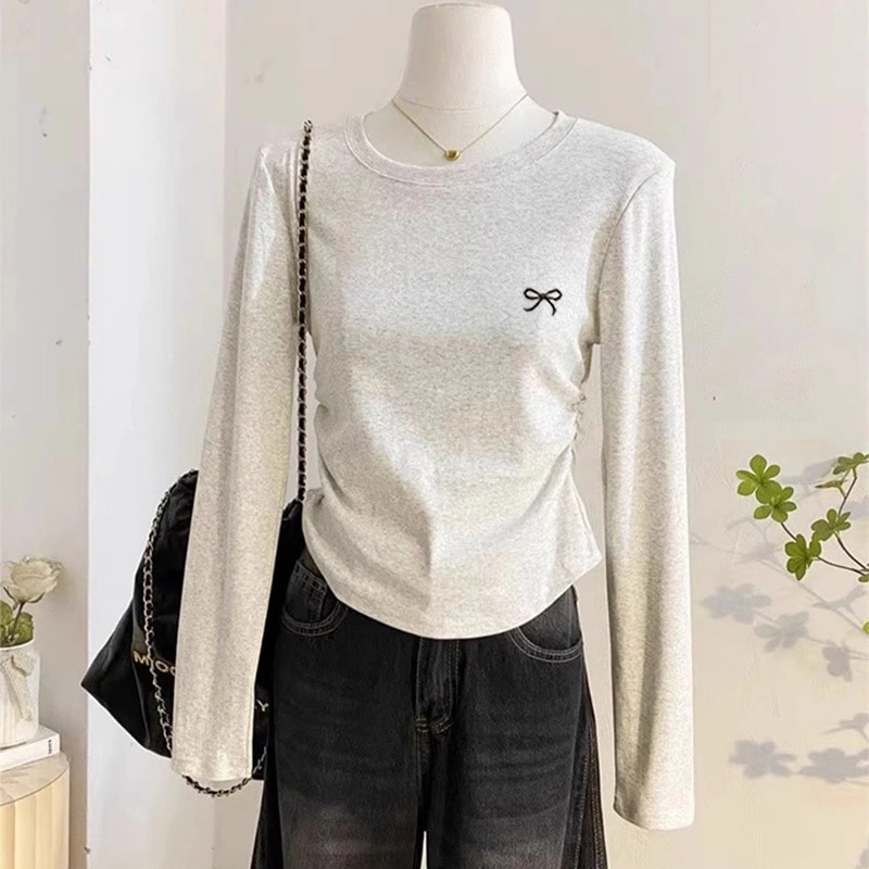 【急速出荷】春秋用ストレートショルダー長袖Tシャツ レディース 無地リボン刺繍プリーツラウンドネック万能インナートップス Tシャツ 長袖