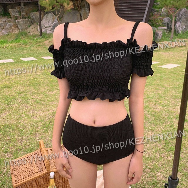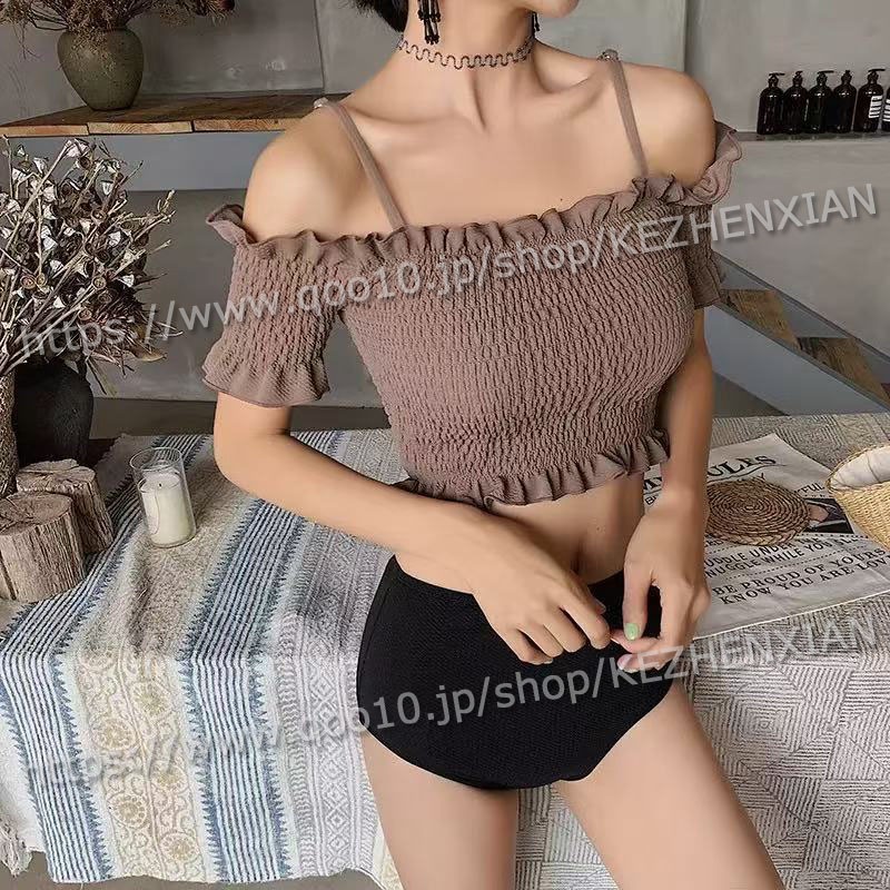 人気 水着 レディース ビキニ 体型カバー ハイウエスト オフショルダー 水着 2点セット 二の腕 パッド一体型