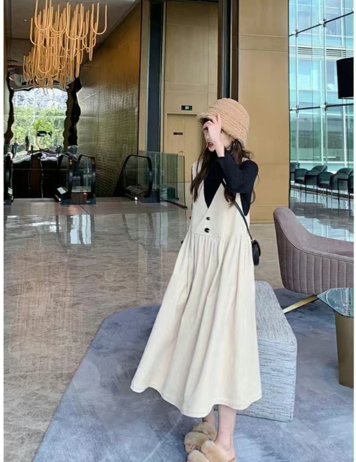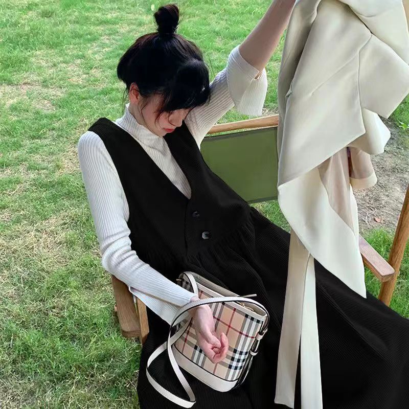 24新作 マタニティワンピースセット 韓国ファッション コーデュロイ Vネック ゆったりワンピース ストラップスカート2点セット