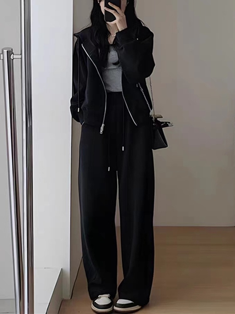 2025秋冬 韓国 かわいいレディース無地フード付き長袖アウターレトロセット黑白フーディーブルサイズ丈トップス春カジュアルスポーツファッション系通学学生袖お出かけダブルアップシルエットトラック
