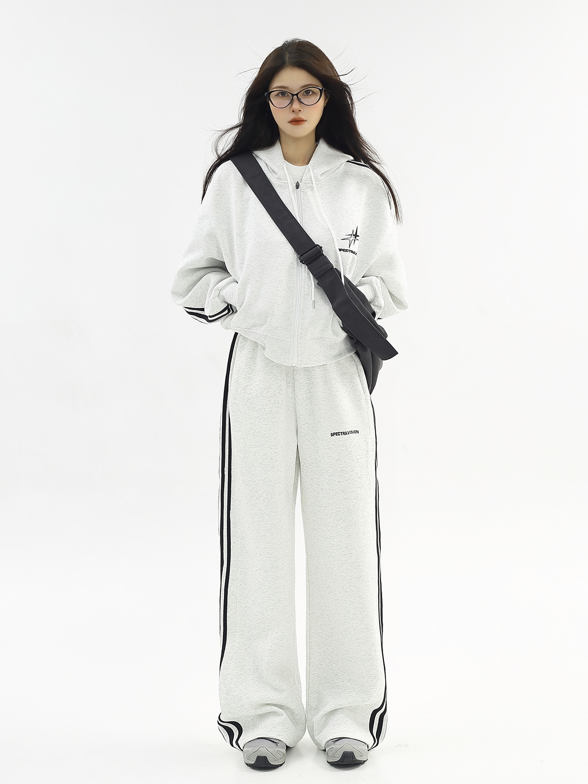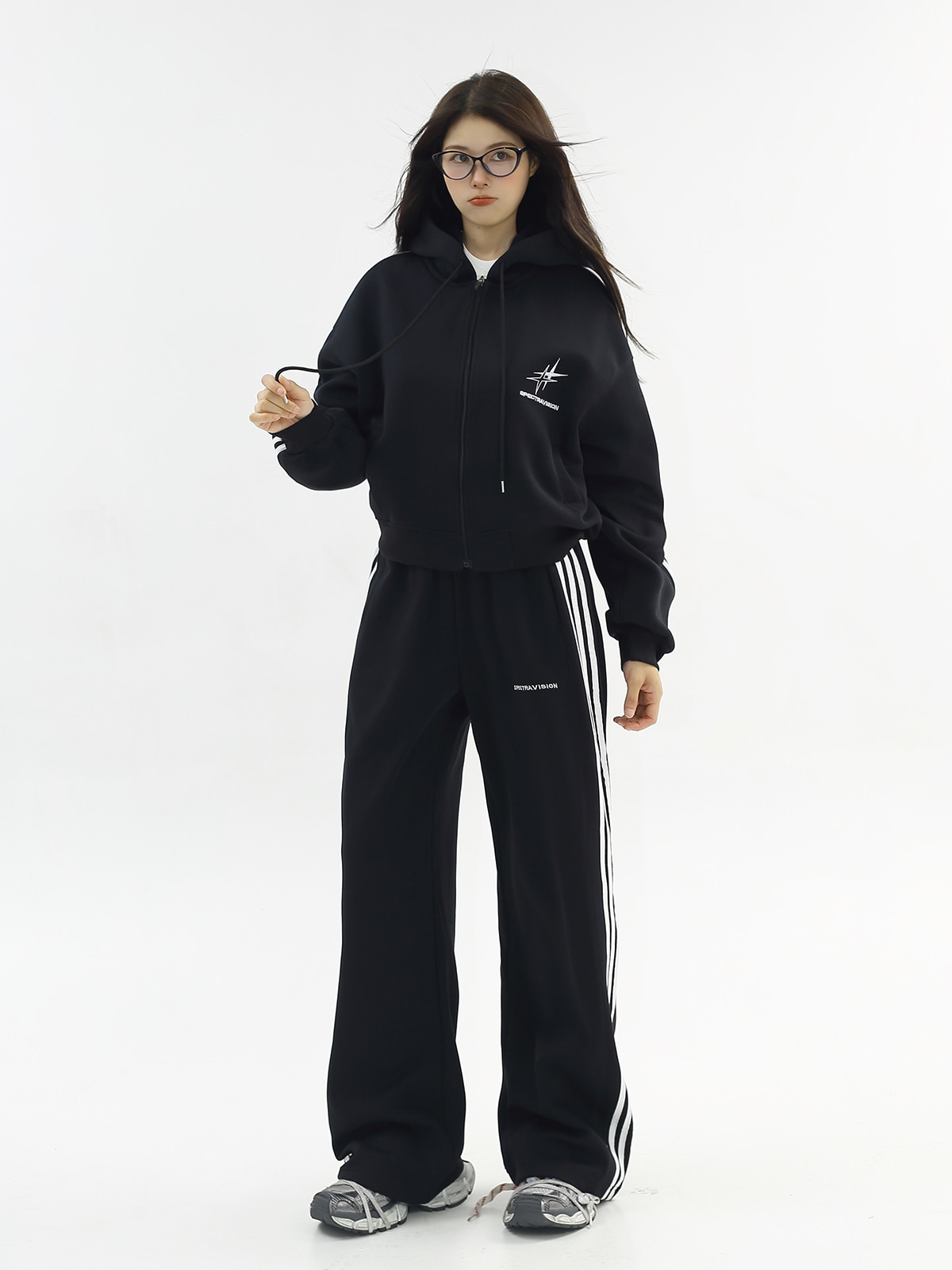 2025 秋冬 韓国 かわいいレディー 無地 フード付き長袖アウターレトロセット黑白フーディーブルサイズ丈トップス春カジュアルスポーツファッション系通学学生袖お出かけアップシルエットトラック上下羽織り