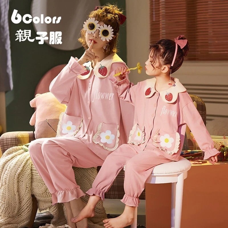 キッズ パジャマ 親子服子供服 綿 女の子 ママと娘 長袖ウェアイチゴ柄太陽花 前開き 春秋冬