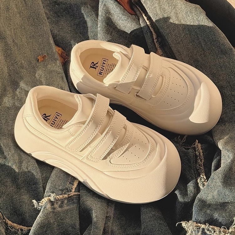 春と秋の新作丑萌大頭カジュアル白靴女増高板靴マジック貼り厚底パン靴