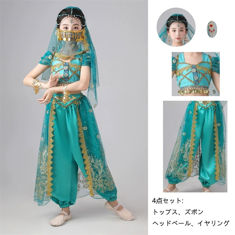 ベリーダンス 衣装 子供 ジャスミン風 ダンス練習着 レッスン着 コスプレ キッズ 女の子 プリンセス コスチューム ハロウィン 仮装 コスプレ衣装 半袖 スパンコール ステージ衣装 演出服 花柄