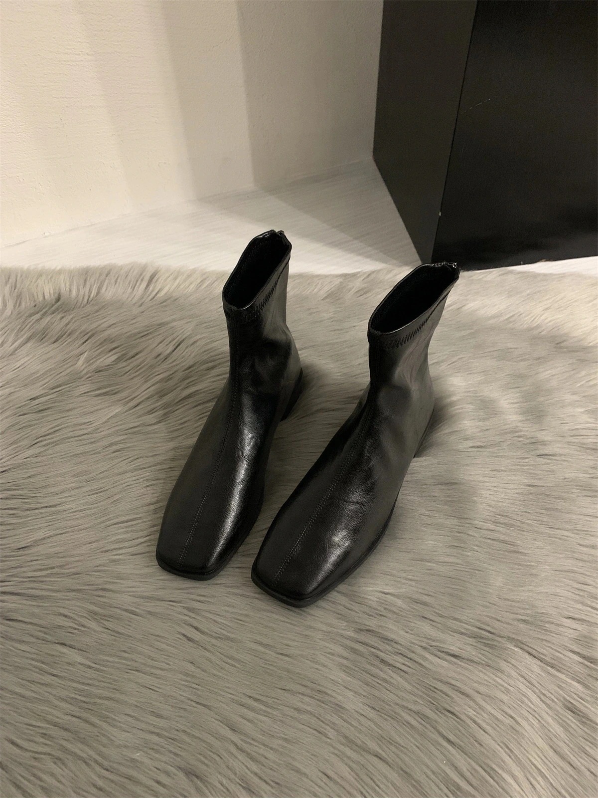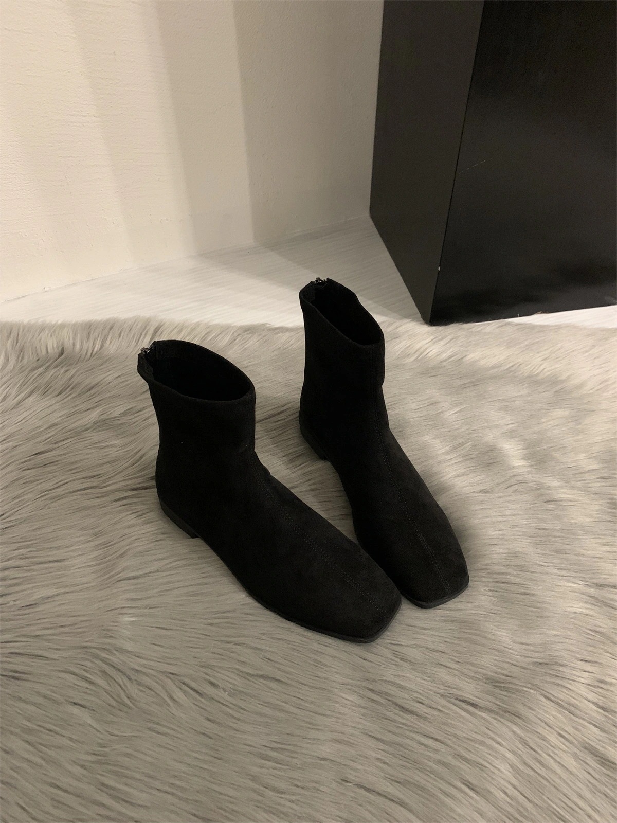 2025秋冬の新作極シンプルファースクエアトップのローヒールとマーチンブーツ女 バックジッパーフラットスリムショートブーツ