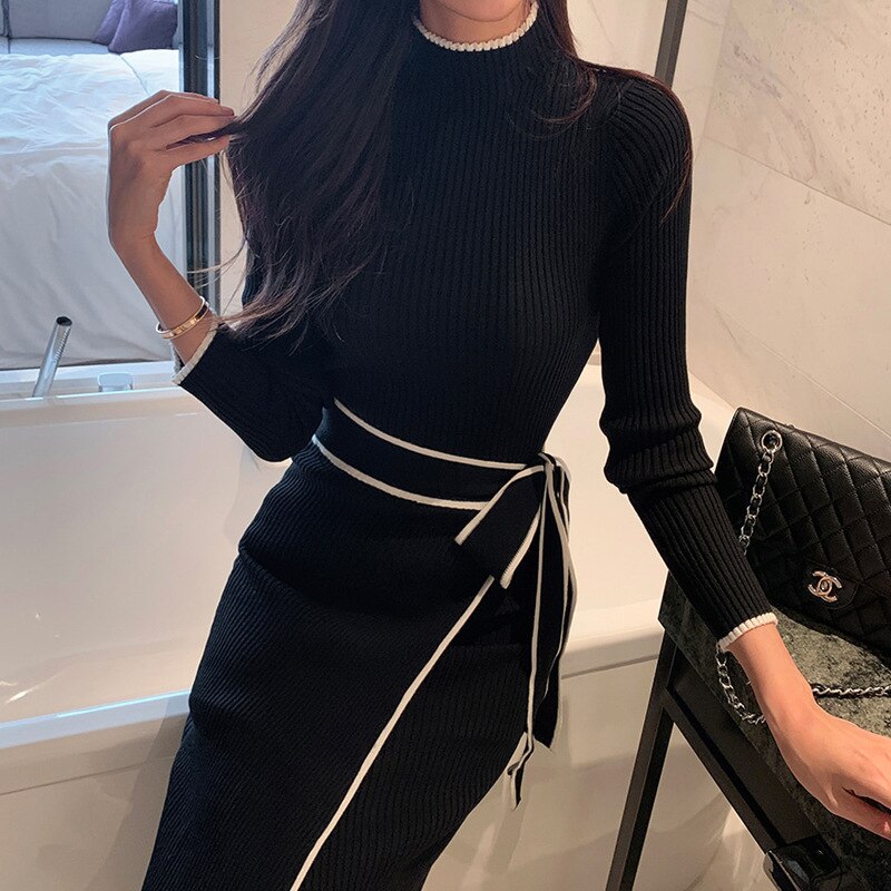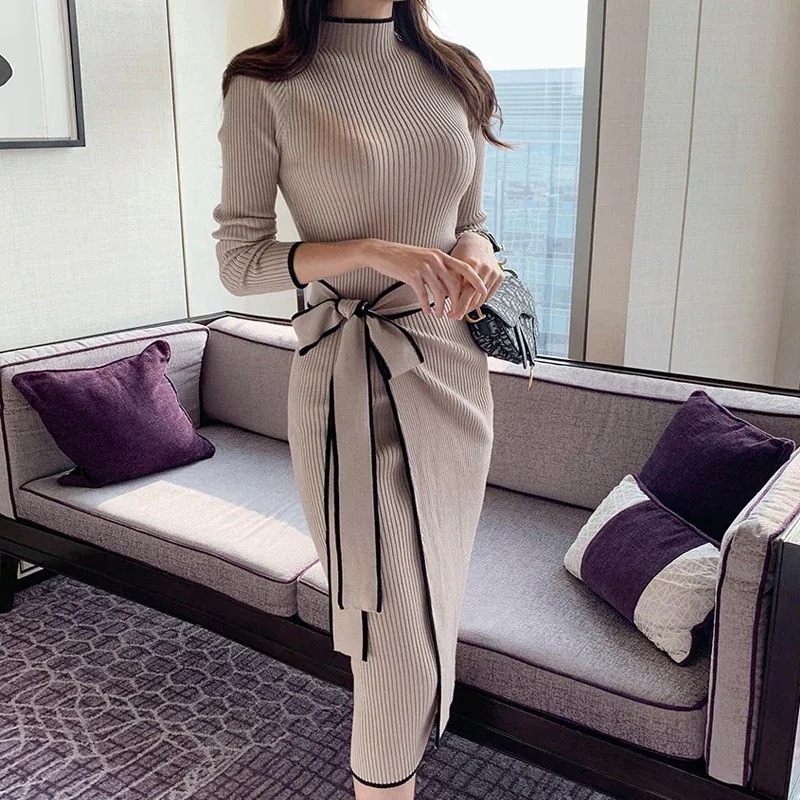 タートルネックニットニットワンピース韓国風ワンピース ロング きれいめ バイカラー ロングワンピース夕イトスカ一ト冬のワンピースリネンワンピ