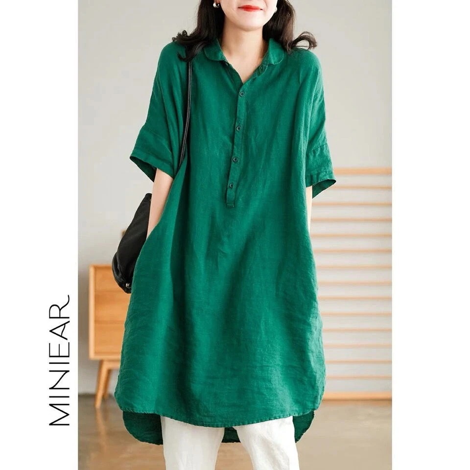 UVカット夏シャツワンピース体型カバーチュニックリネン素材トップス レトロ無地亜麻セミロングシャツ夏ゆったり五分袖ワンピースチュニック長袖ブラウスシアーシャツ日焼け防止ワンピース レディース