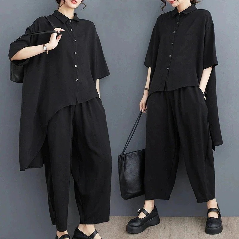 【お勧め商品】「ファットガール」ブラウス+7分丈パンツ 夏 上下セット お尻すぽっり 体型カバー 着痩せ ゆったり 大きいサイズ セットアップ ママスーツ ジャージ 卒業式 人気 メガ割