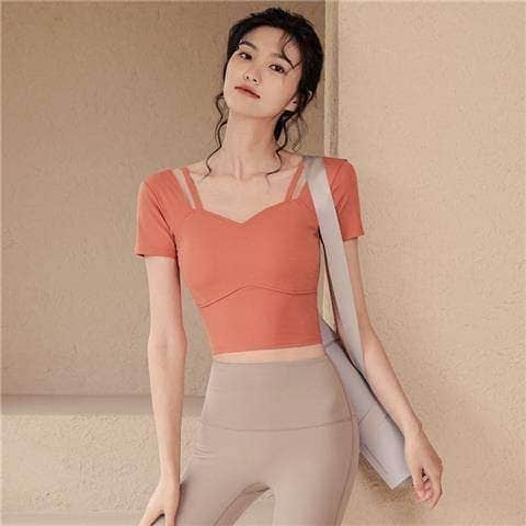 お家ヨガウェア 胸パッド付き半袖ヨガウェア女性美背中運動フィットネスウェア上着ランニングトレーニングピラティス演技体操 レディース