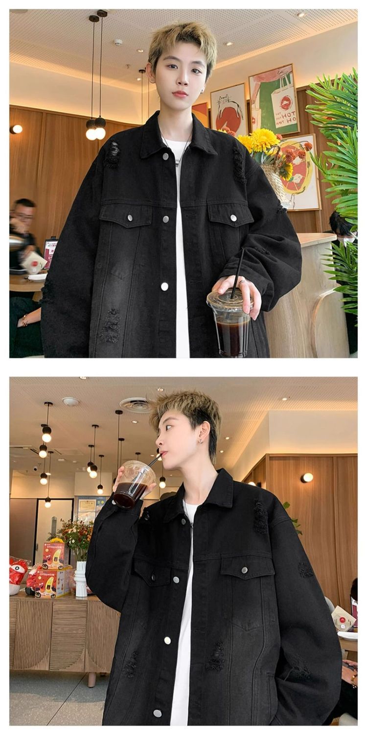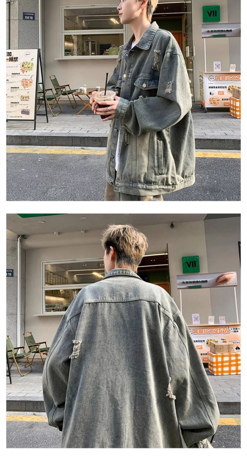 破れジーンズジャケットメンズファッション万能コーディネート春秋用高級感ワイルドでクールアメリカンレトロワークウェアジャケット衣類