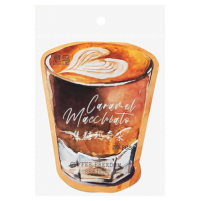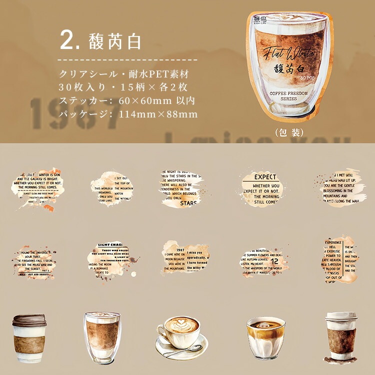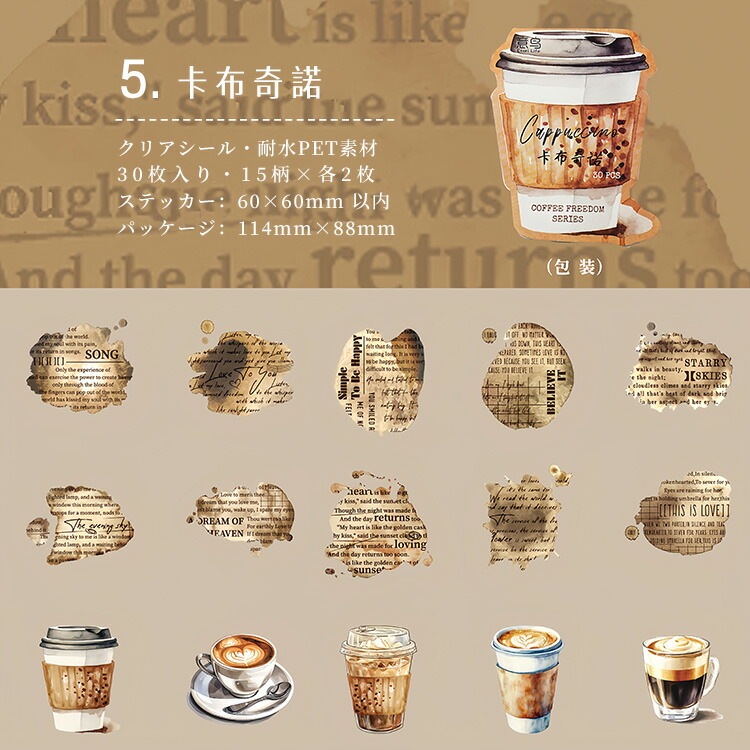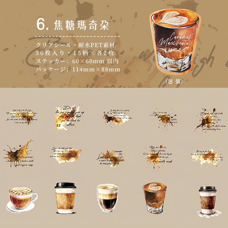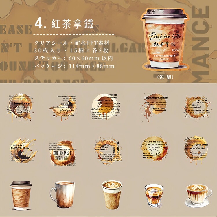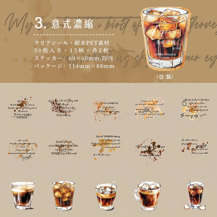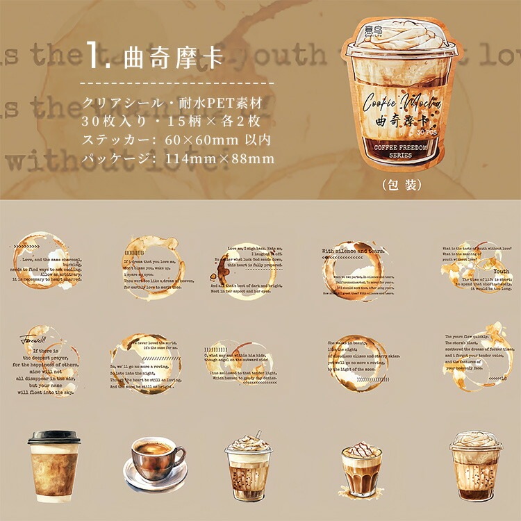 クリアシール コーヒー 珈琲 カフェ ぼかし インク 背景 泡 あわ 英語 透明 暈し イラストシール PET 耐水 シール 30枚 コラージュ素材 おしゃれ 手帳シール sztz-30-348