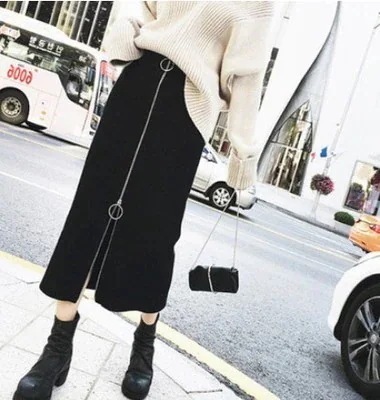 フロントリングジッパースカート 韓国ファッション スカート タイトスカート 着痩せ ロングスカート