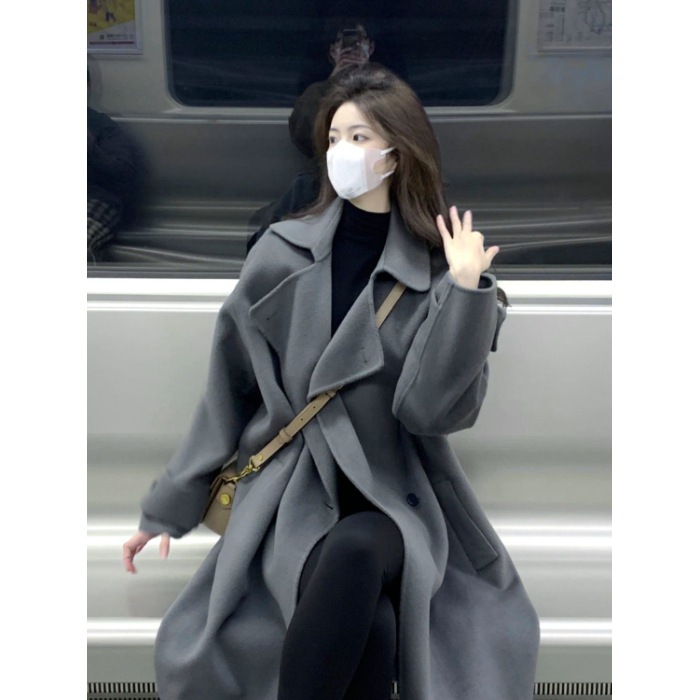 グレーの両面カシミアウールコート 女性用ミディ丈 秋冬新作 高級感のある小柄向けダウンジャケット