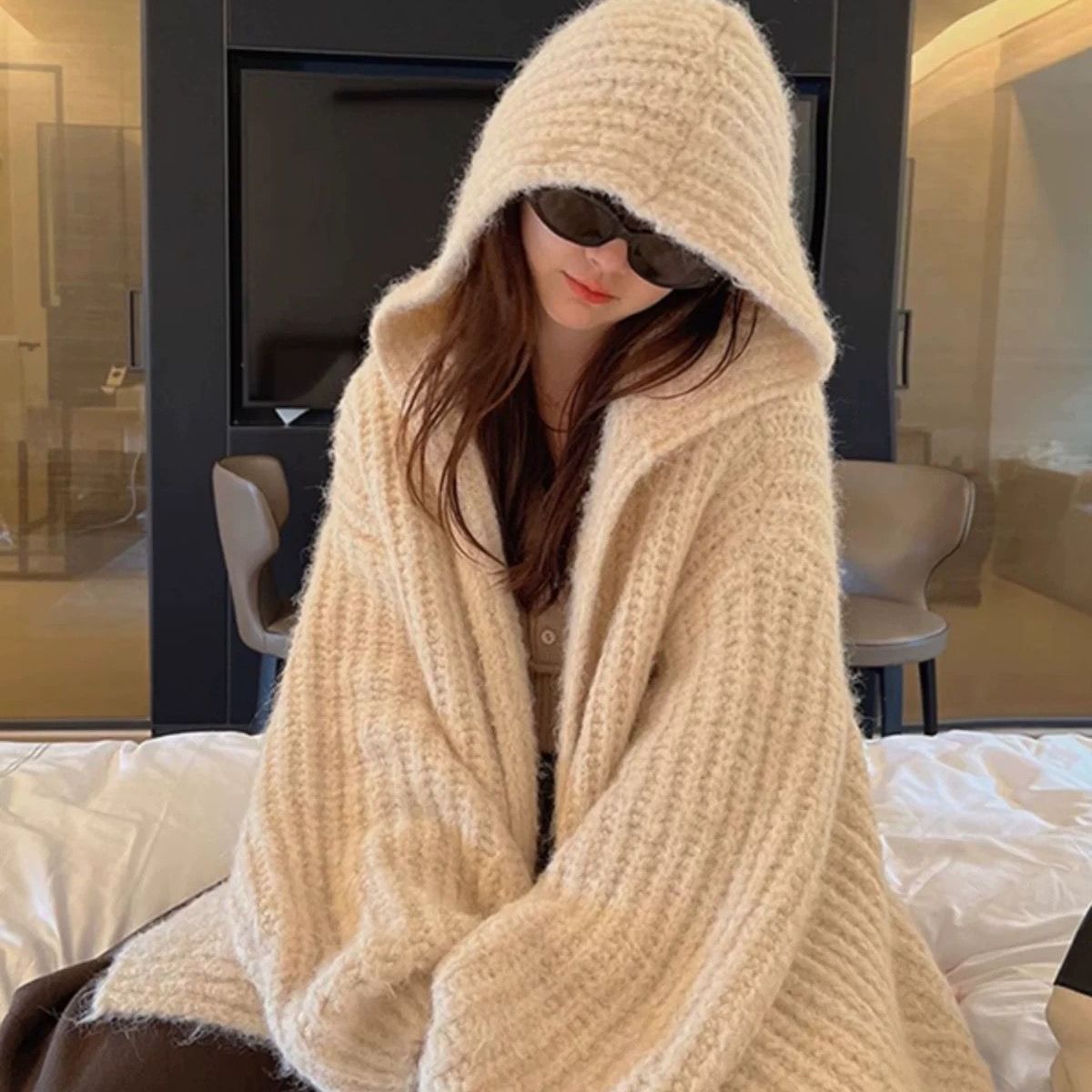 秋冬用のゆったりした毛糸ハーフコート 新品 韓国風 リラックスカット ニットカーディガン 中丈 加厚シェニール