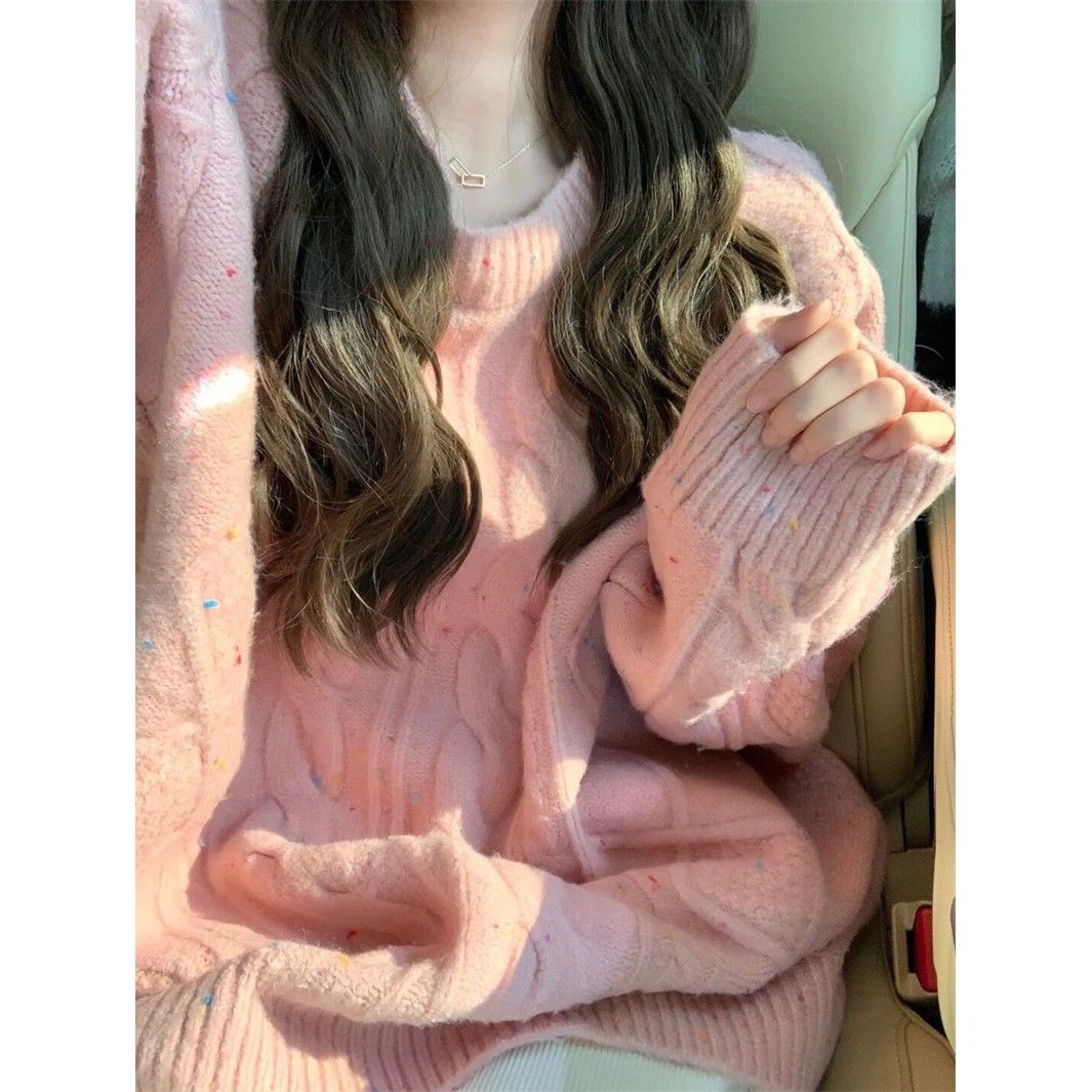 ピンクセーター女性のは柔らかくてモチモチしていてだるくて痩せて見える丸首の優しいヘッジ編みトップスあったかカシミヤタッチ
