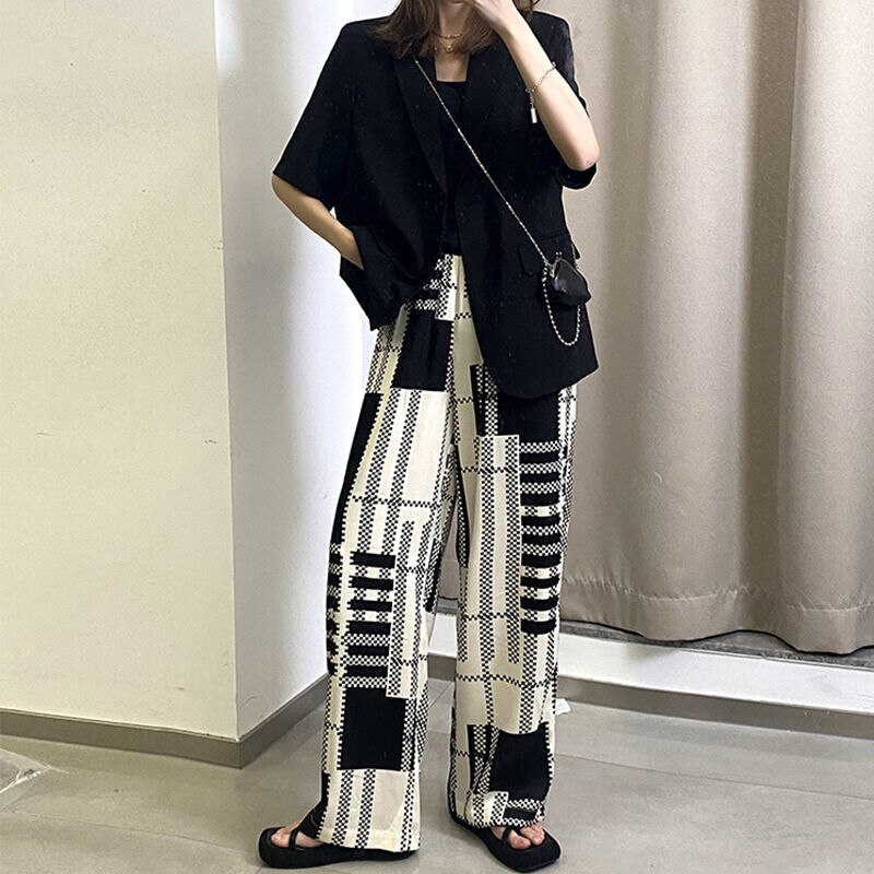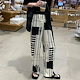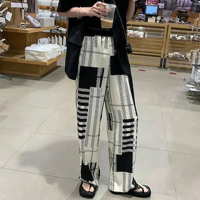 ひんやりボトムス ワイドパンツ ストレート 韓国ファッション 体型カバー 接触冷感ボトムス ゆったり 港風 絞り染 白黒チェック ウエストゴムパンツ ストレート ハイウエスト