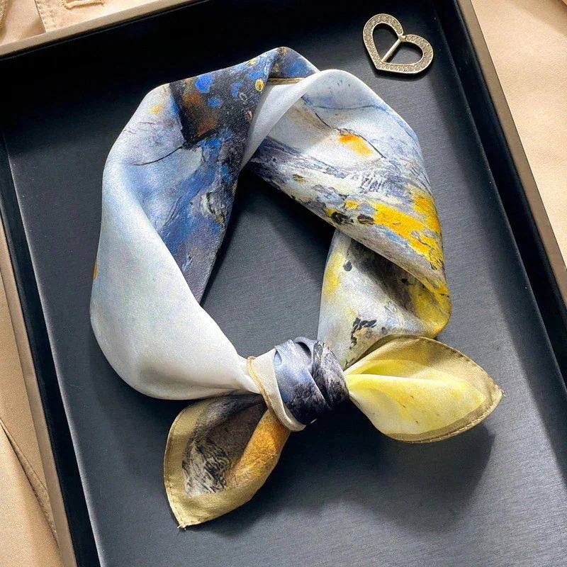 【父の日 母の日贈り物】ボヘミアンファッション シルク100% スカーフ 53cm 正方形 マフラー ストール ネックウォーマー 青 幾何学模様 ギフト包装 春 秋 ネッカチーフ プレゼント
