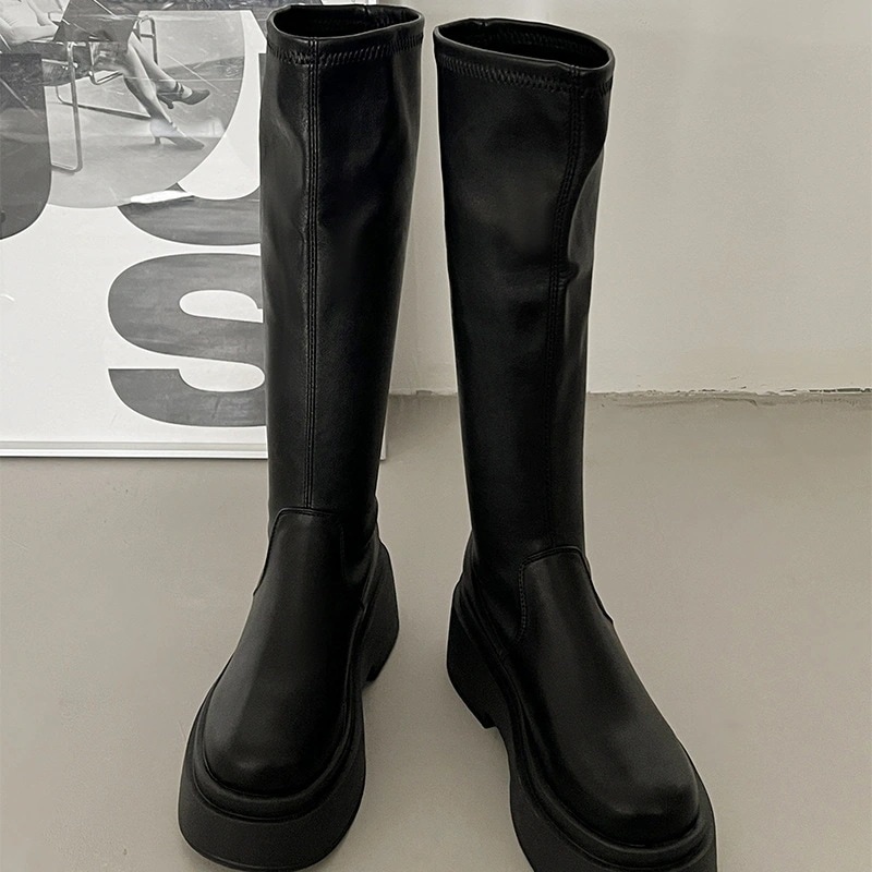 Qoo10限定 ブラック膝上丈ハイカットスカート合わせレディース 2026年新作秋用レトロスリム小柄ロングブーツ 厚底ブーツ