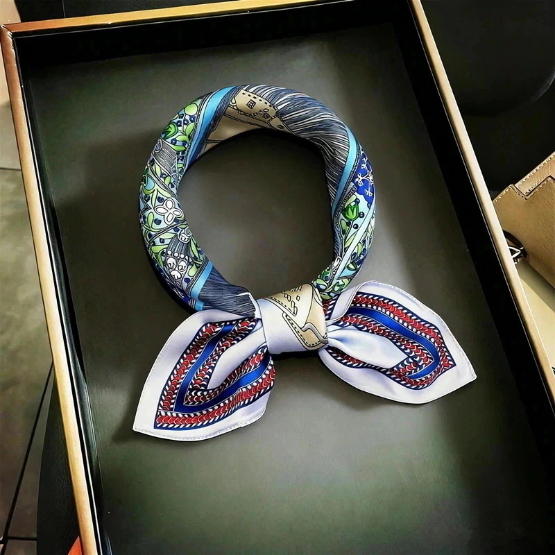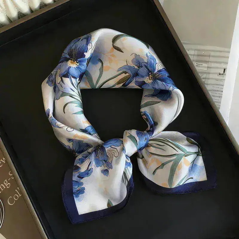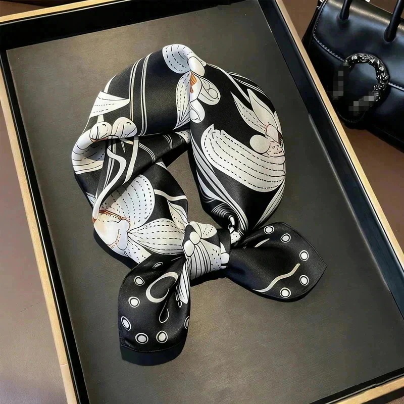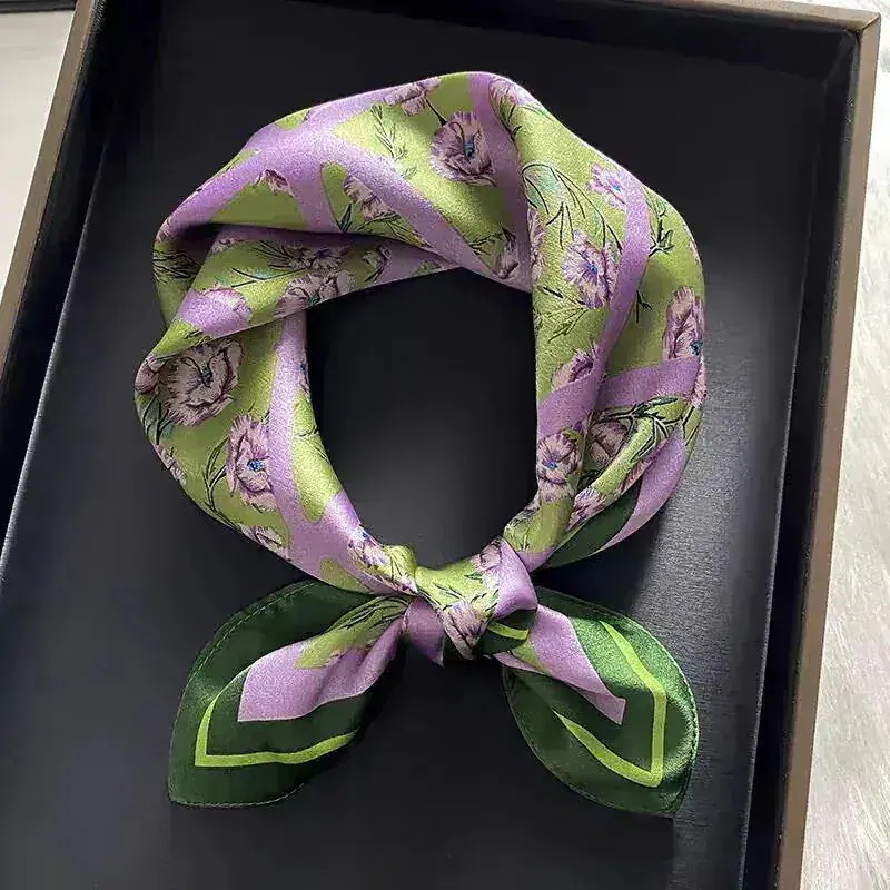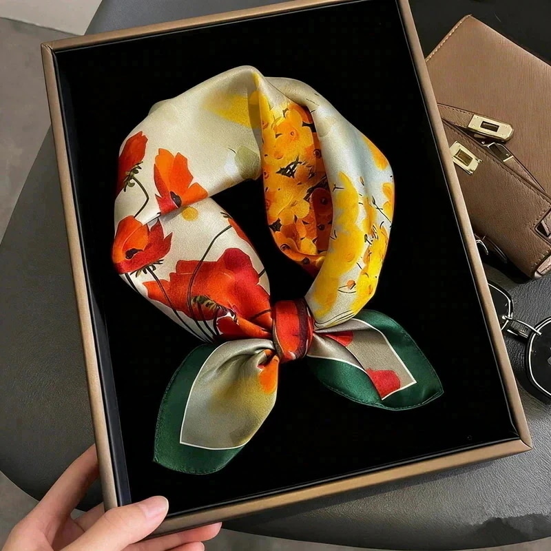 レディース メンズ シルク100% スカーフ 53cm 桑蚕絲 カキ フラワー プリント 春夏 ヘッドスカーフ として ギフト バッグアクセサリー