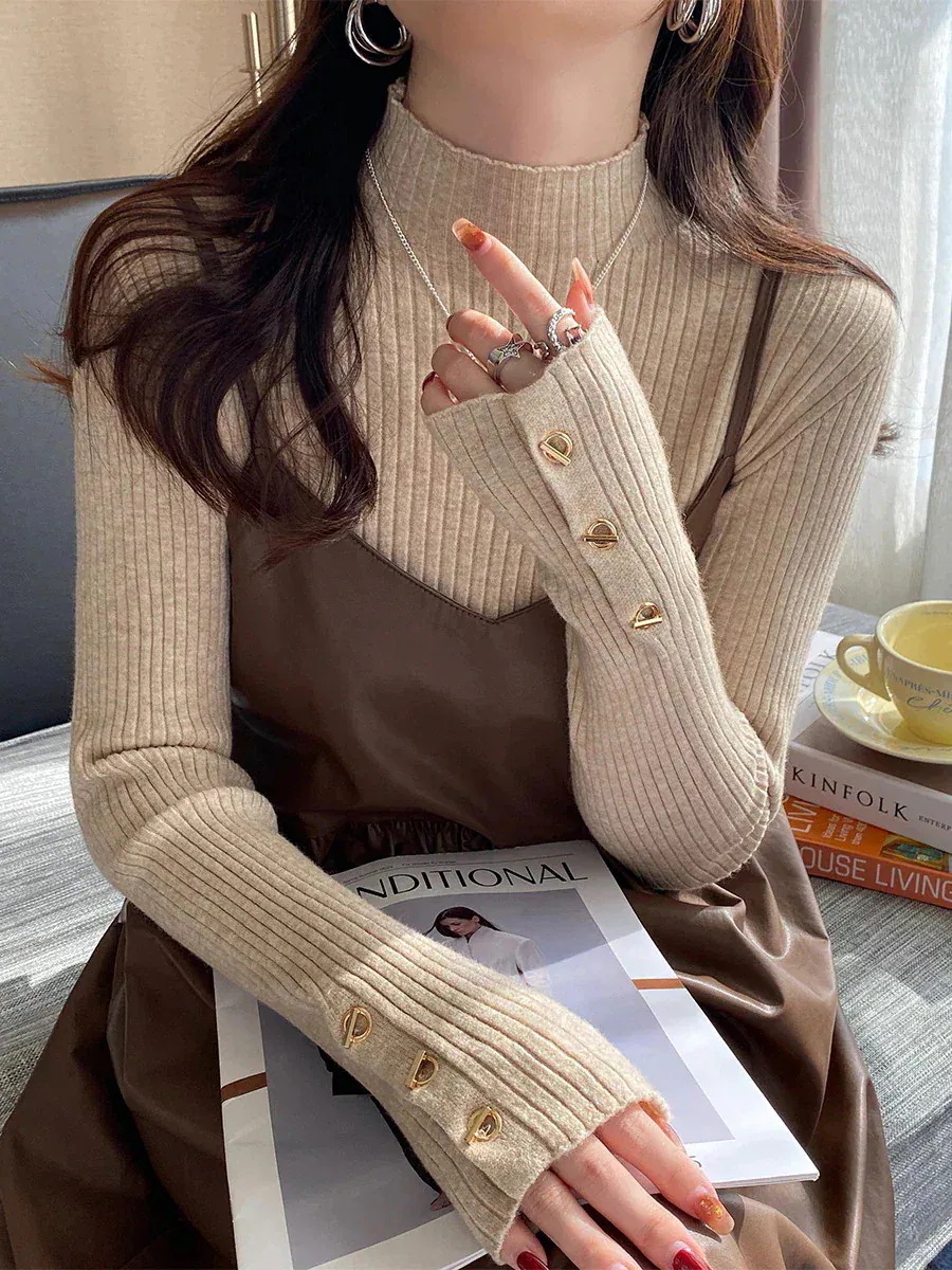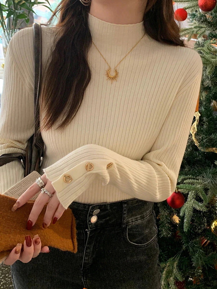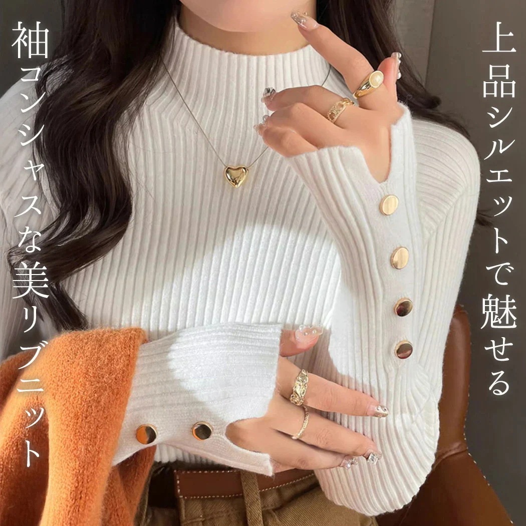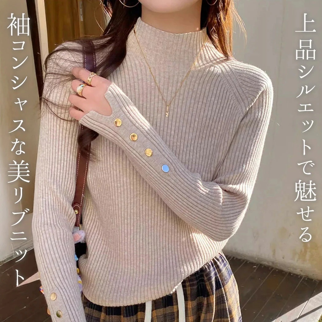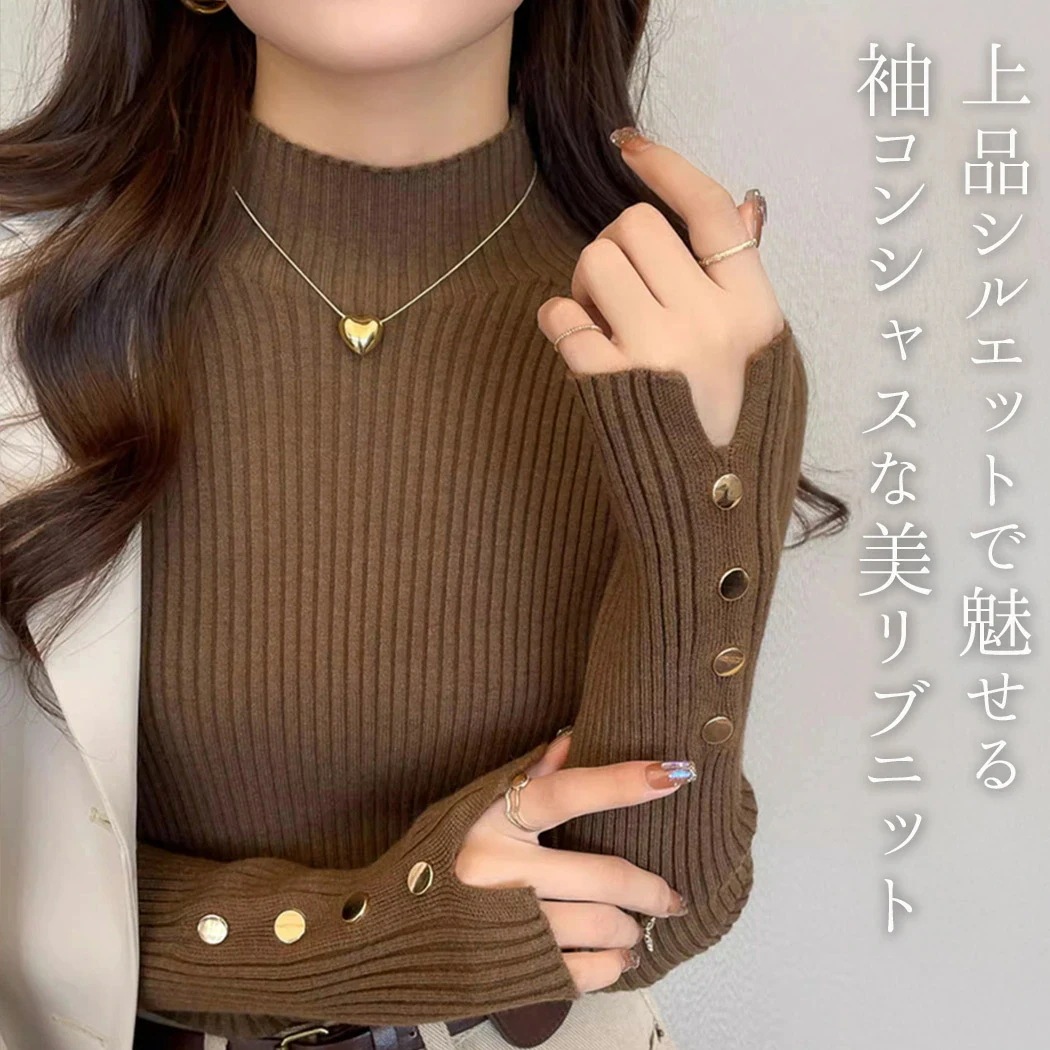 「美袖できれいめに」ニット 春 秋 冬 トップス リブ カットソー レディース 長袖 きれいめ マンテル ワイドリブ 柔らかい インナー レイヤード ハイネック プルオーバー セットインスリーブ 細見