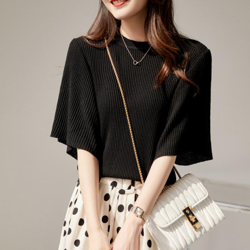 新作 ラッフル シンプル サマーニット 快適 丸ネック ニット トップス アウター サマーニット 韓国ファッション ラウンドネック セーター ベーシックニット 人気なリブニット リボン