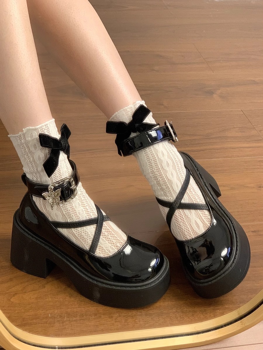 厚底メリージェーンレザーシューズレディース夏用シングルバックルラウンドトゥフレンチレトロ厚底ハイヒールシューズ