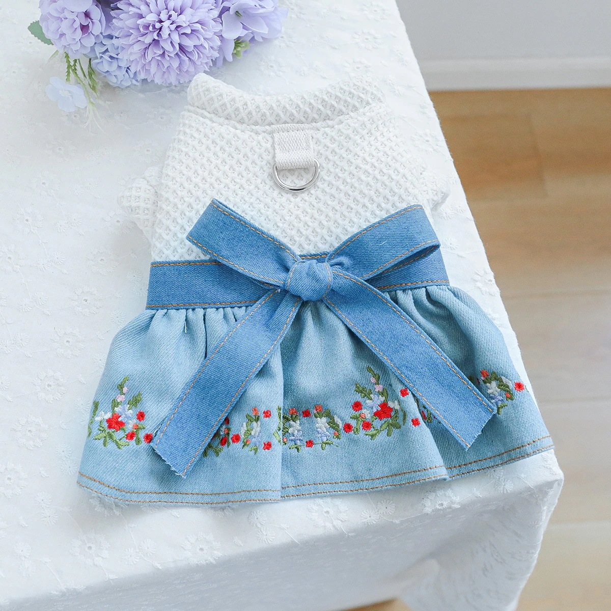 ペット服 犬服 秋冬 花柄 デニムスカート