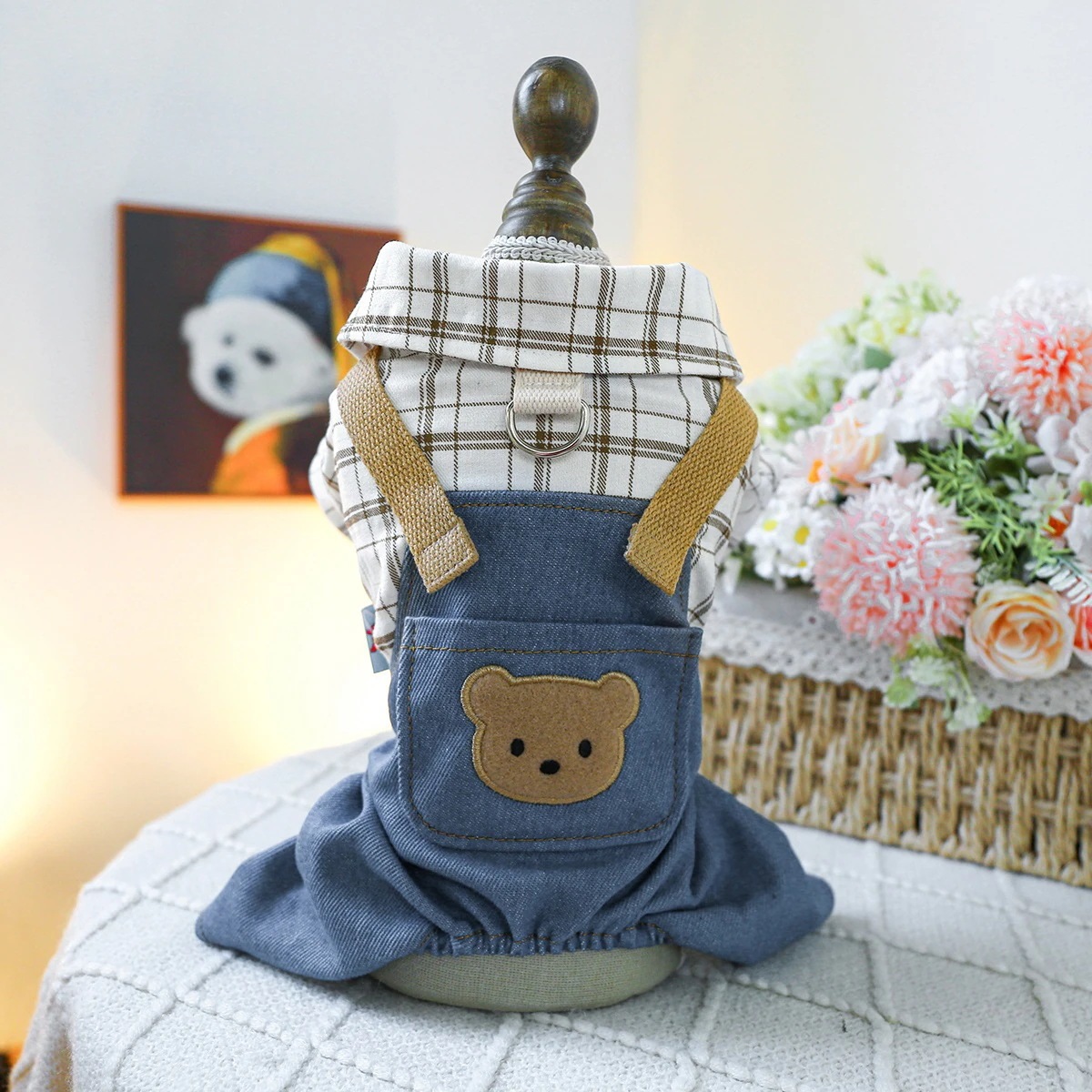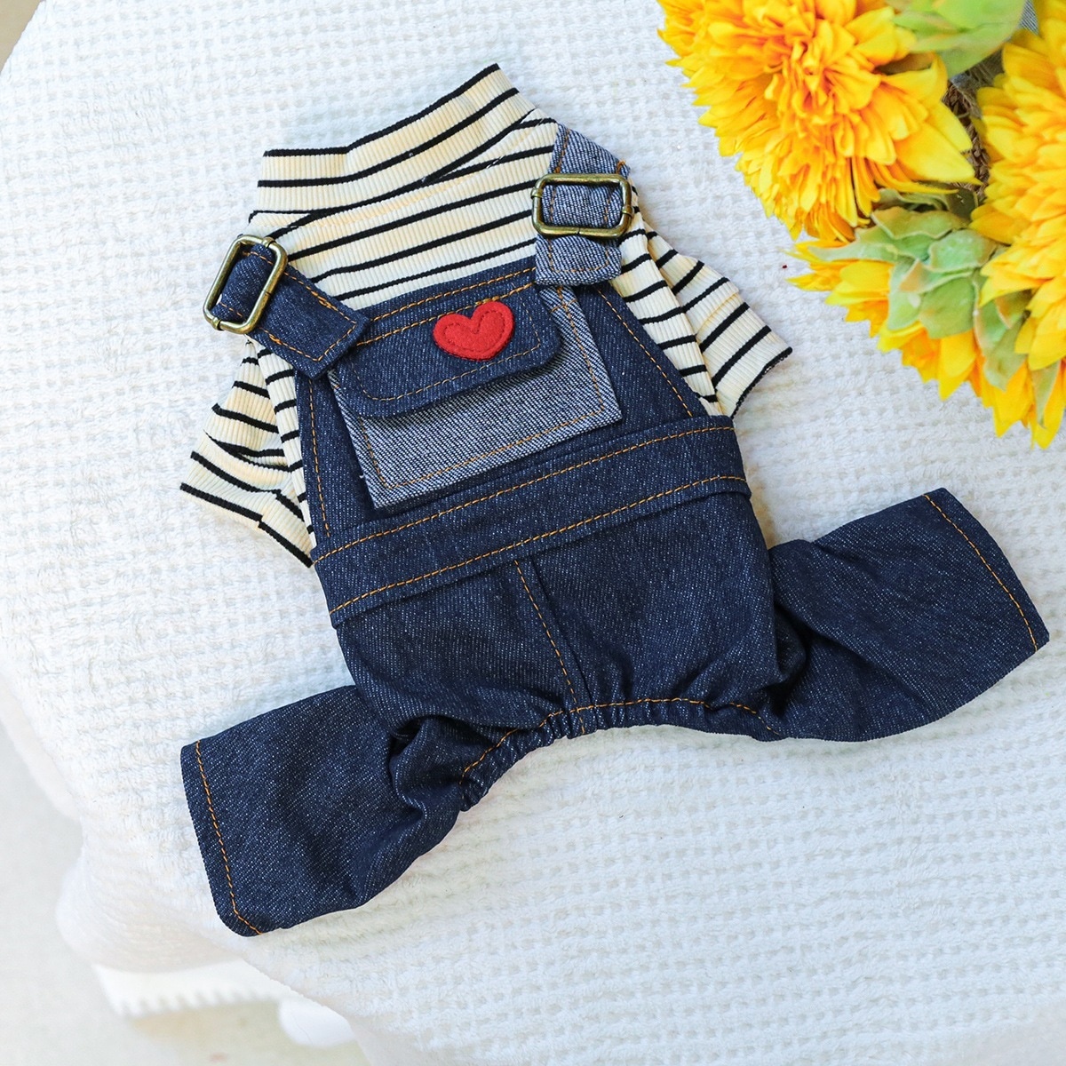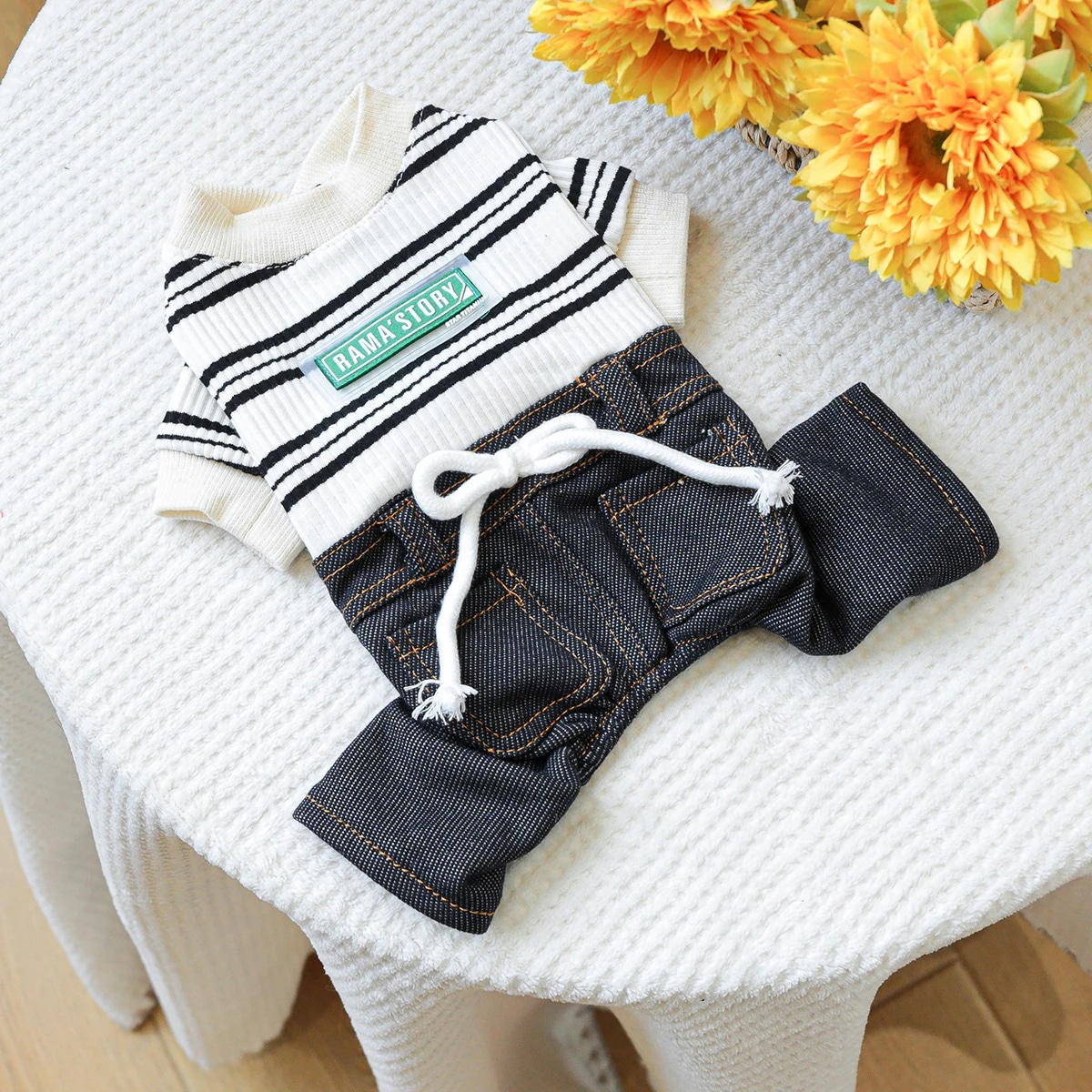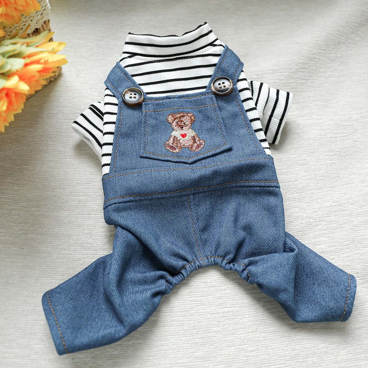 ペットサークル 子犬用服 オーバーオール 胸バック クマの頭 ジーンズ - 黒と白のストライプ柄 ペット服