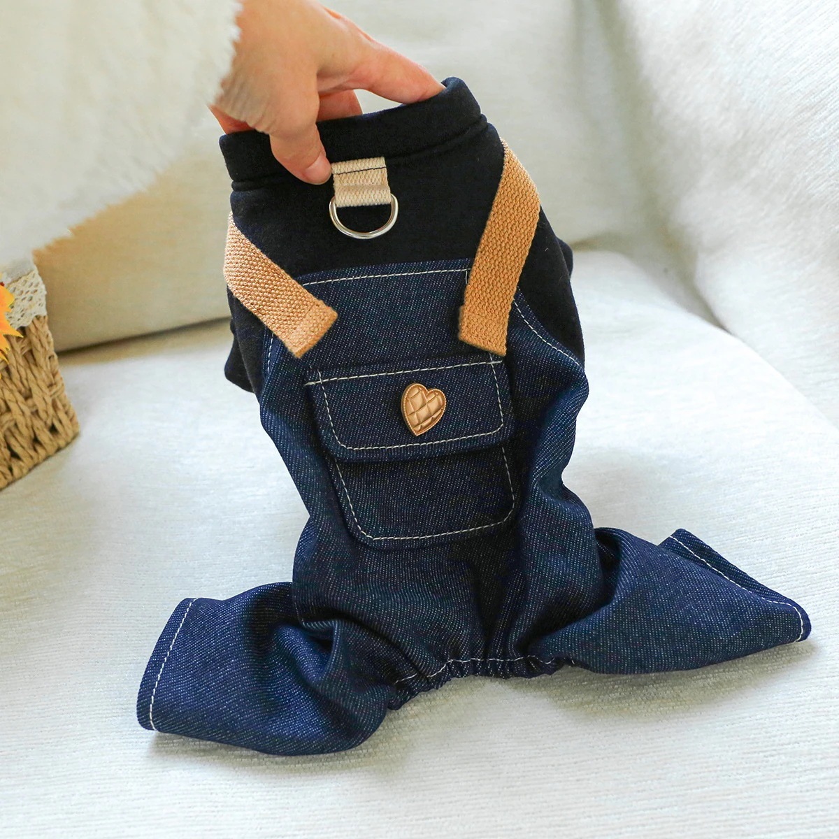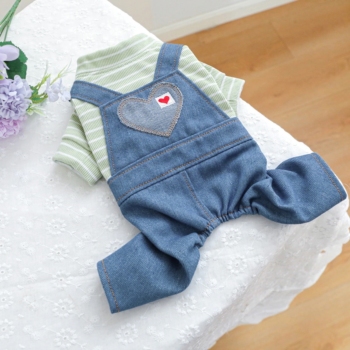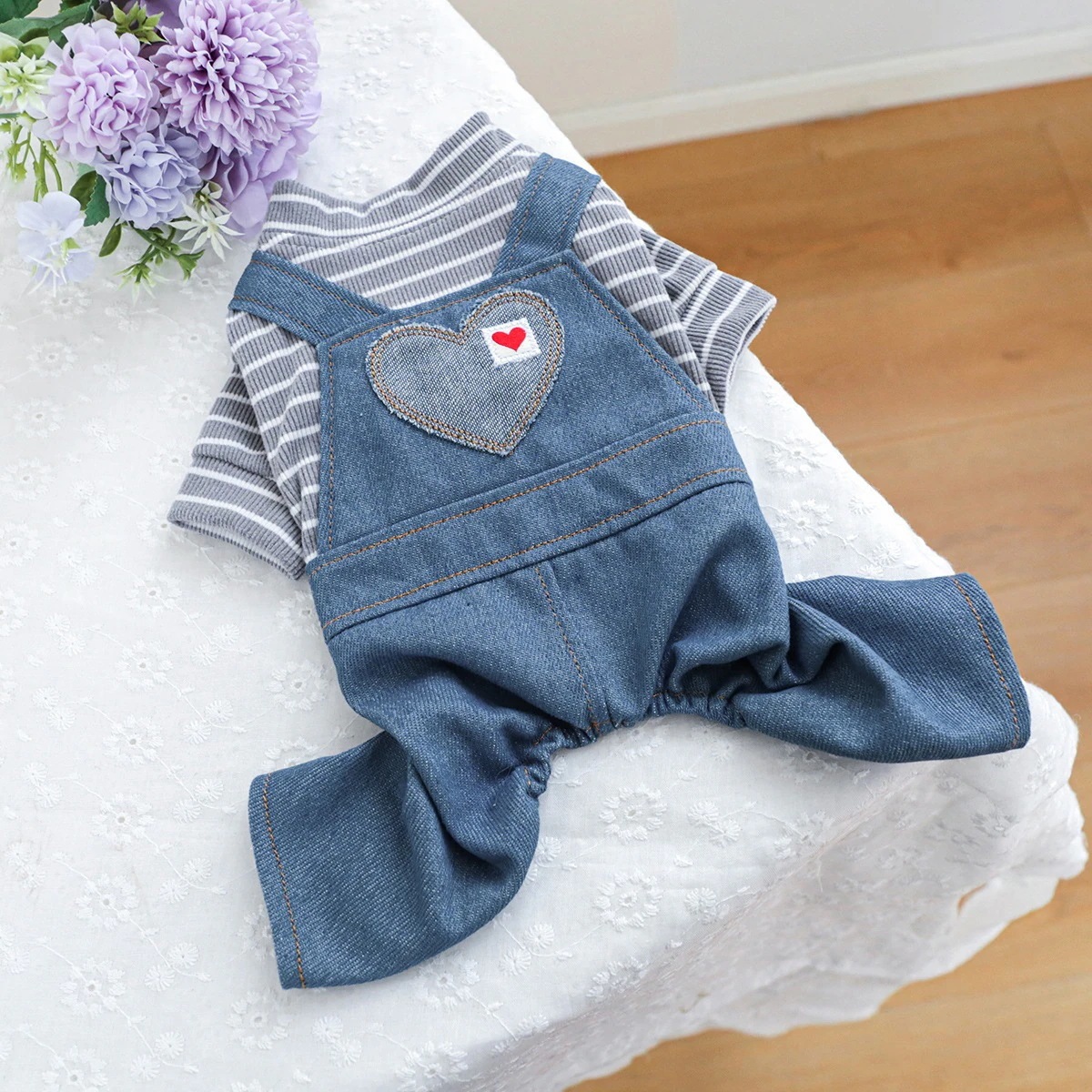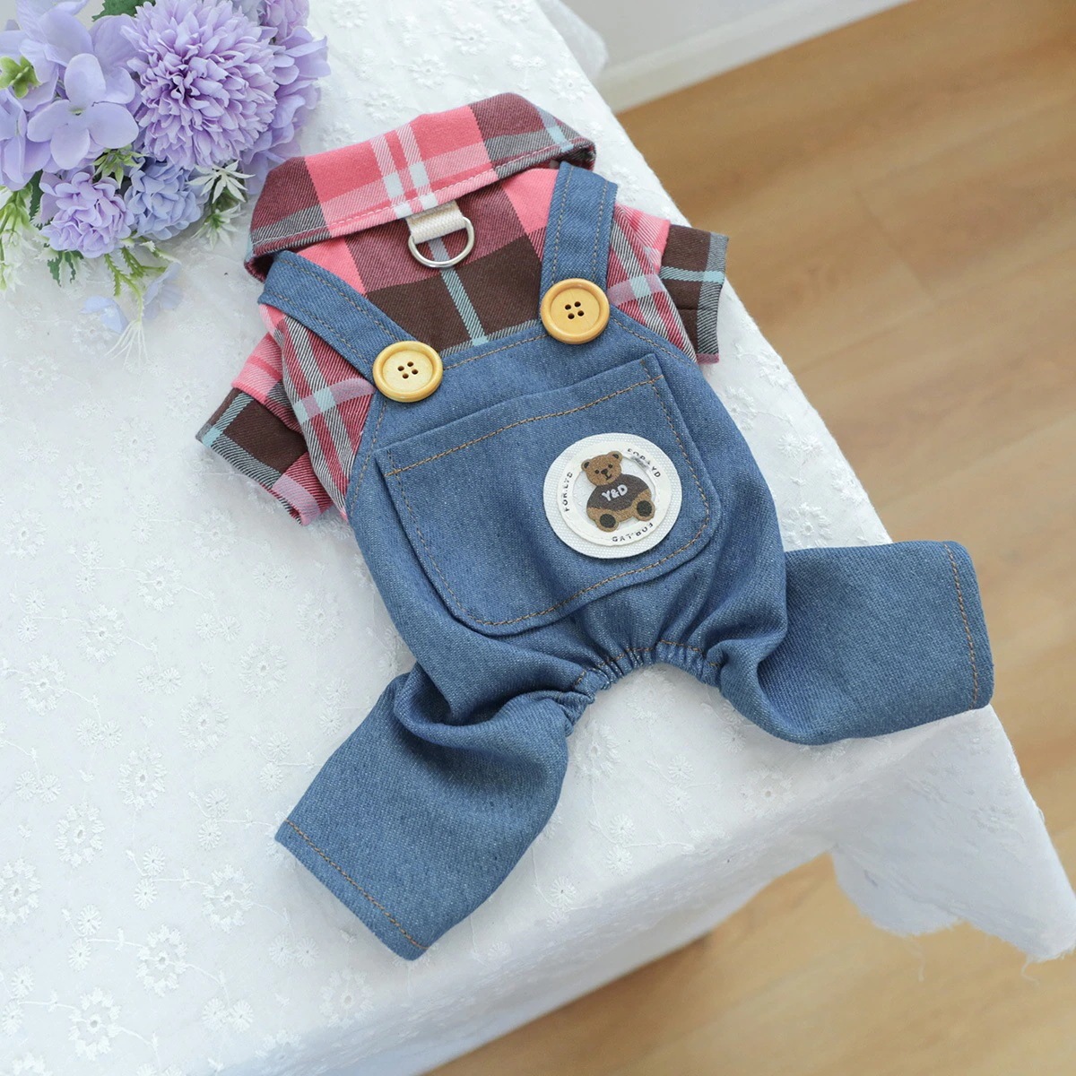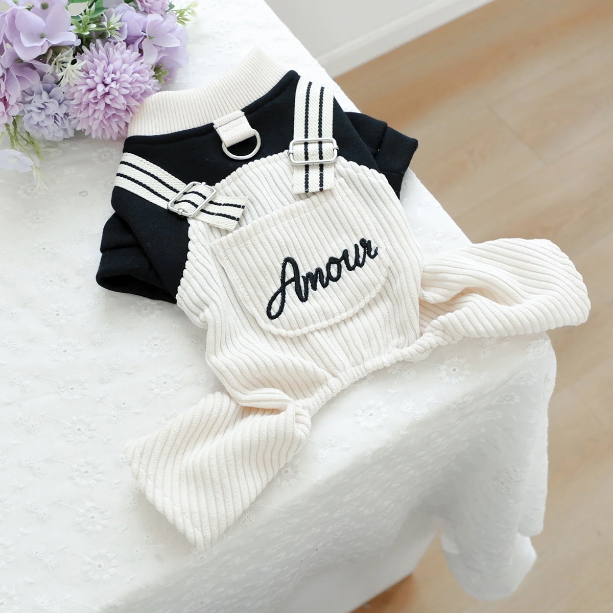 ペットサークル 子犬用服 オーバーオール 胸バック クマの頭 ジーンズ - 黒と白のストライプ柄 ペット服