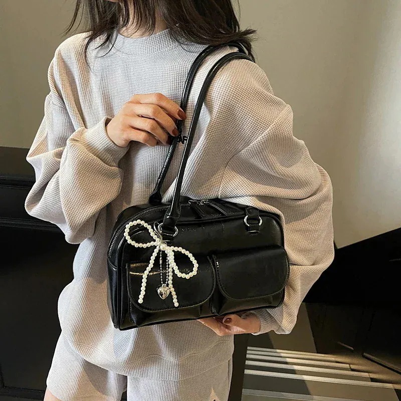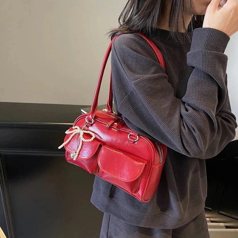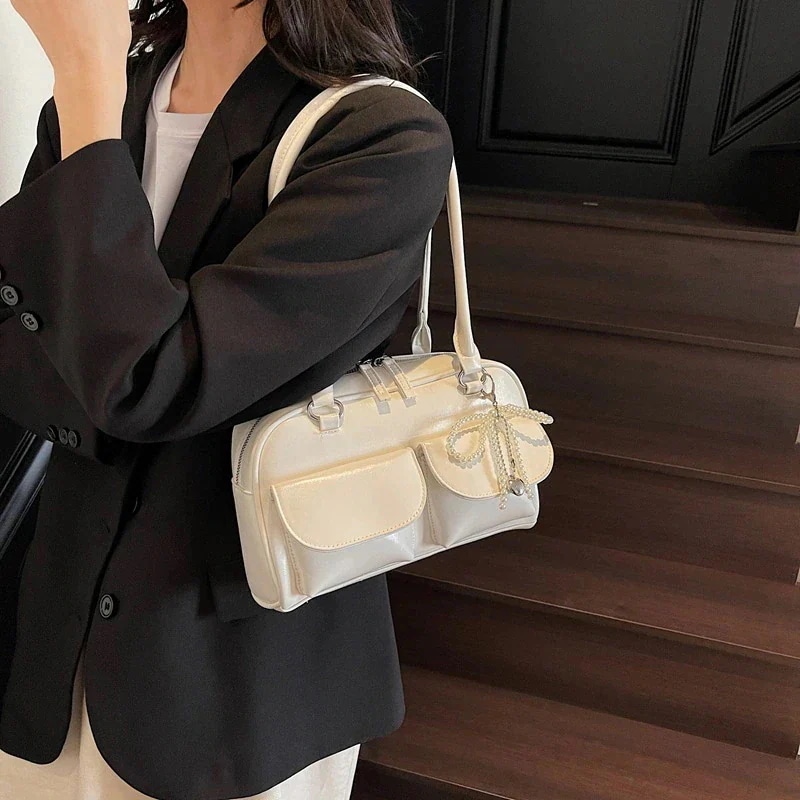 人气ショルダーバッグ 横長ボストンバッグ 韓国スタイルのデザインアンダーアームボストンバッグ25シンプルなポータブルボウリングバッグ大容量ショルダーバッグ 韓国ファッション
