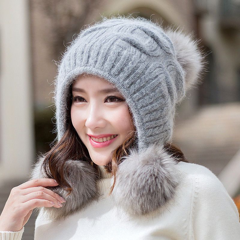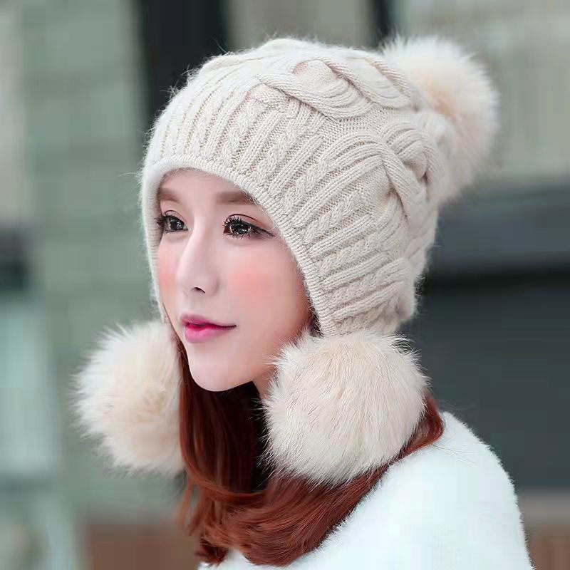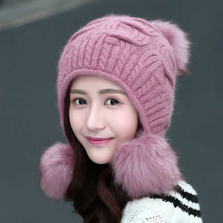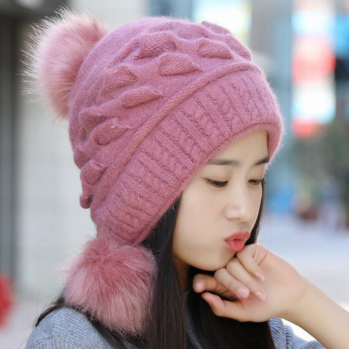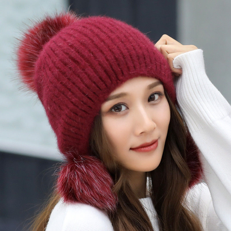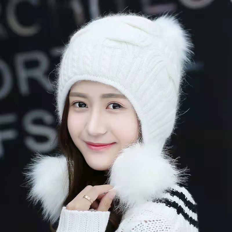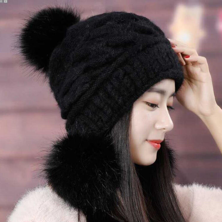 人气韓国ファッション帽子 ウサギ毛 レディース 厚手防寒 可愛い 耳を保護する ニット帽 暖かい 毛玉 ハット [タイプ]