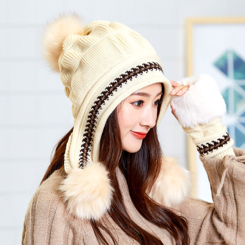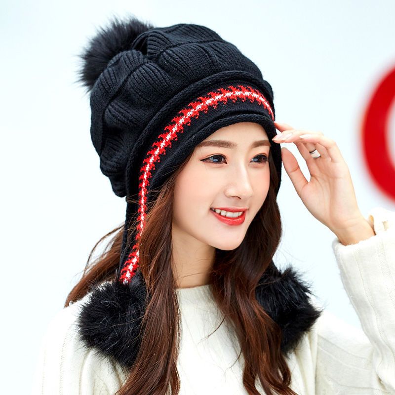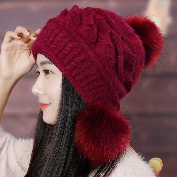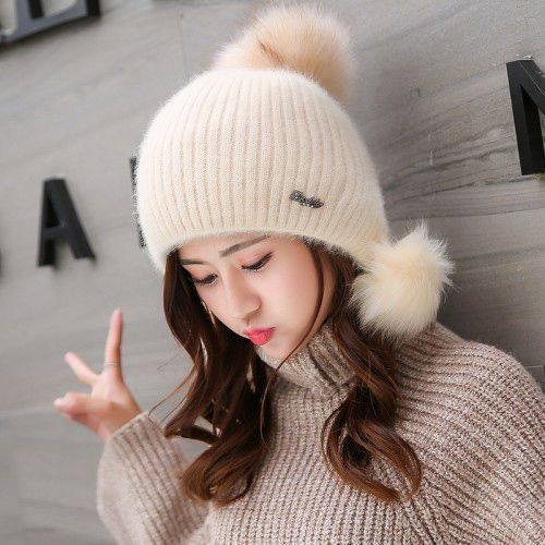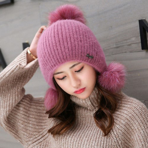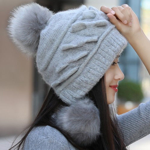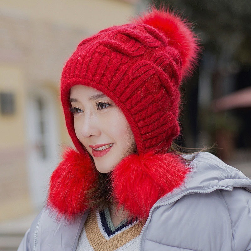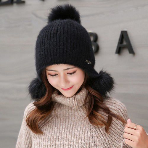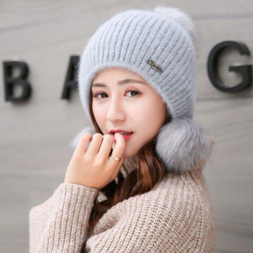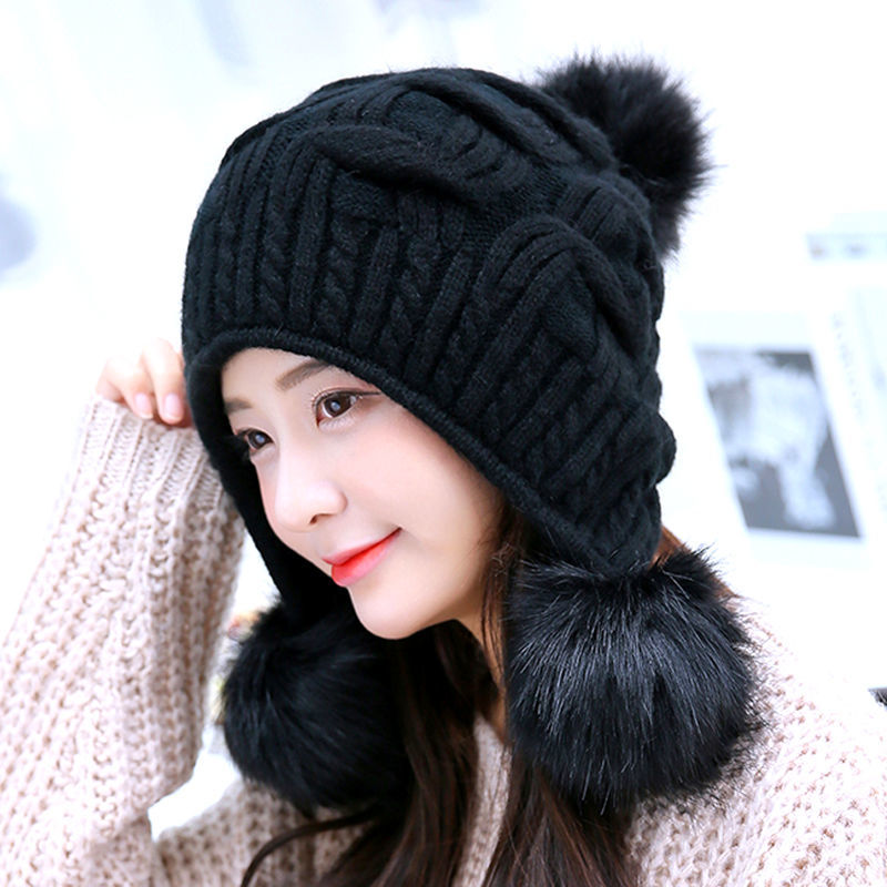 人气韓国ファッション帽子 ウサギ毛 レディース 厚手防寒 可愛い 耳を保護する ニット帽 暖かい 毛玉 ハット [タイプ]