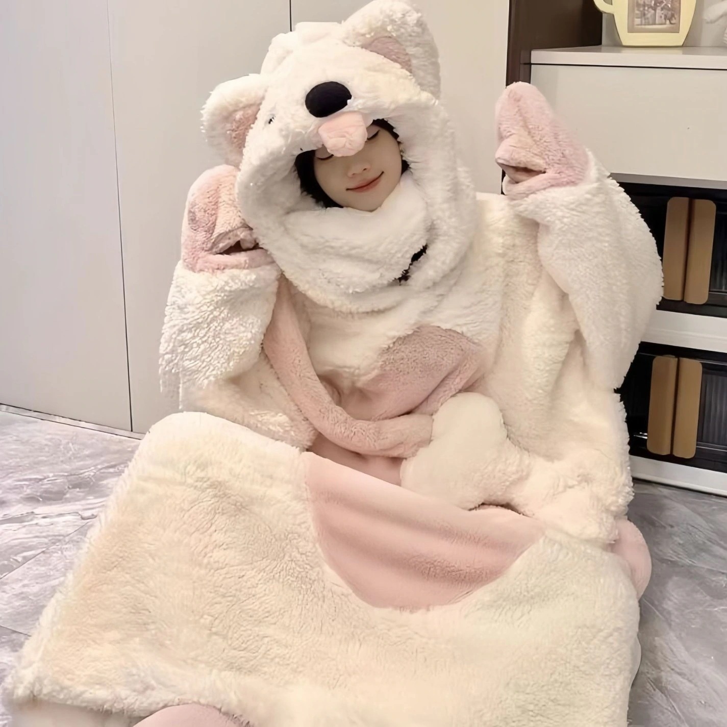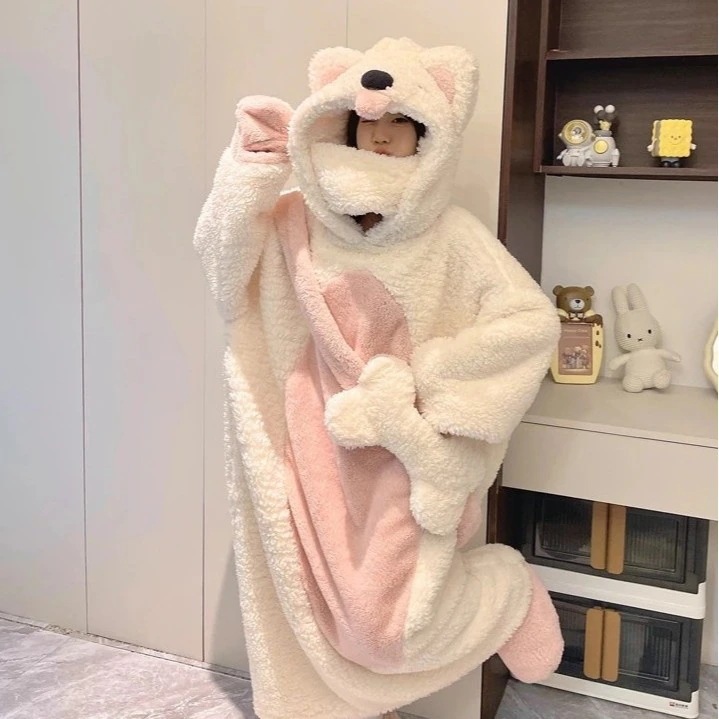 あったかルームウェア かわいい子犬のために帽子をかぶる珊瑚絨毯スリーパー女性秋冬新型加絨毯厚手部屋着パジャマ