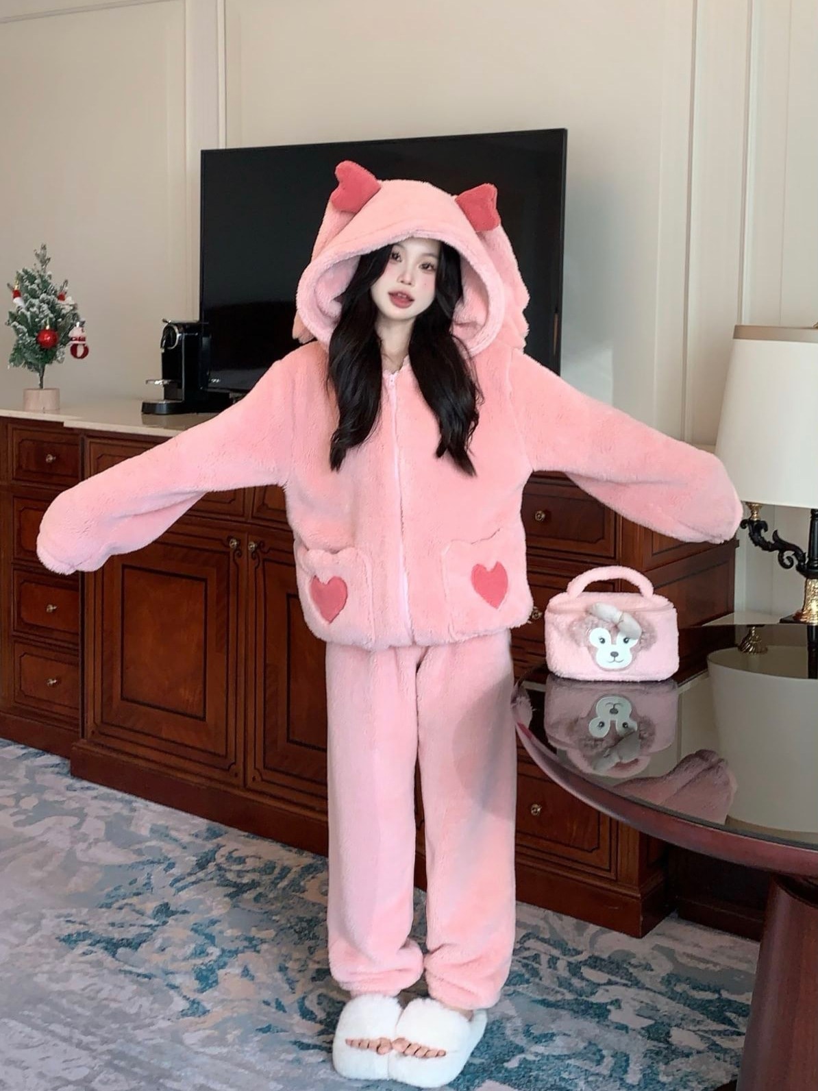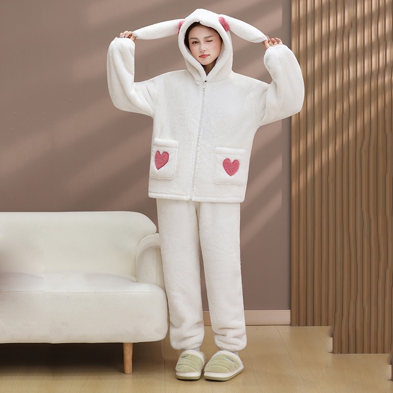 人気パジャマ コーラルフリースパジャマ レディース 秋冬用裏地付き厚手新作ハートポケットフランネルホームウェアセット外出着可能着ぐるみパジャマ
