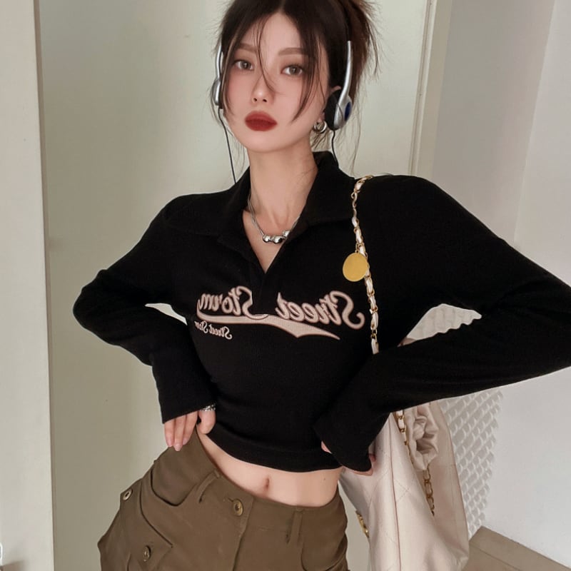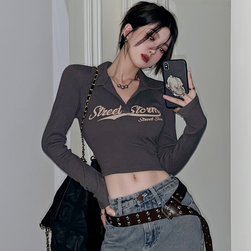 大人気! スキッパー ロゴ ロンT カットソー 長袖 ショート丈 ミニ Vネック カジュアル フェミニン ストリート 女っぽ 色っぽ フィット スリットネック 長袖 T