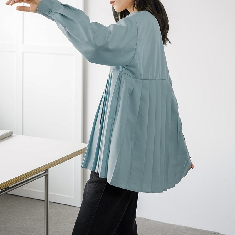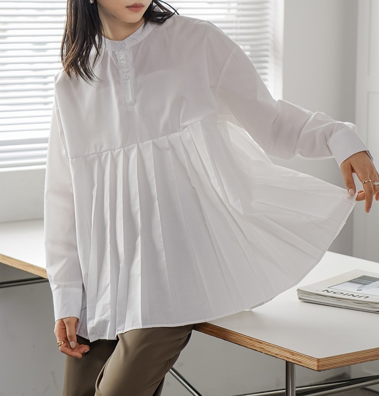シャツ ブラウス プリーツ切替バンドカラーシャツ ブラウス シャツ レディース 長袖 ノーカラー ミドル丈 無地 オフィス カジュアル ゆったり 秋服 体型カバー