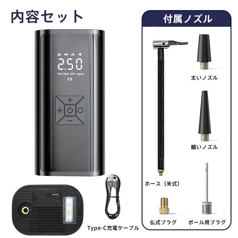 電動空気入れ 空気入れ 自動車 自転車 バイク ボール 浮き輪 USB充電式 エアーポンプ 急速充填 LEDライト 仏式 米式 自動停止 空気充填