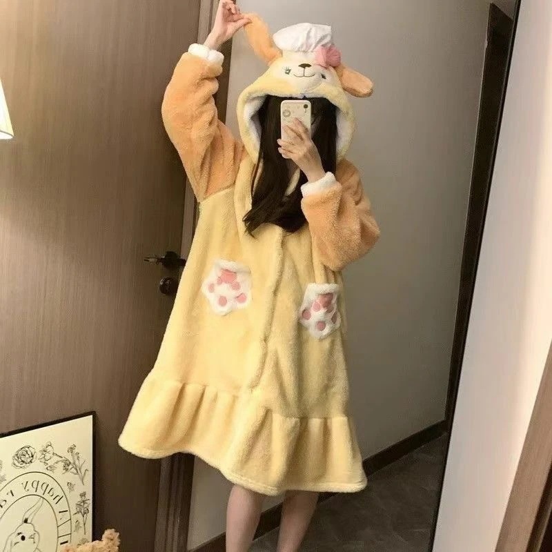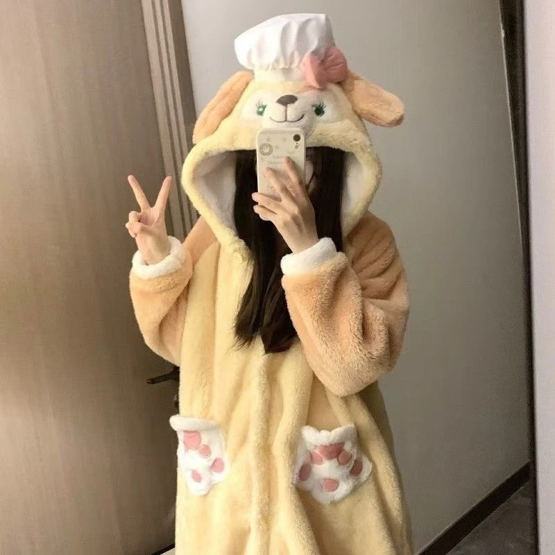 【人気商品】着ぐるみパジャマ バタークッキーシェフ犬パジャマ レディース 冬用コーラルフリース厚手裏地付き冬用ロングガウンホームウェアセット