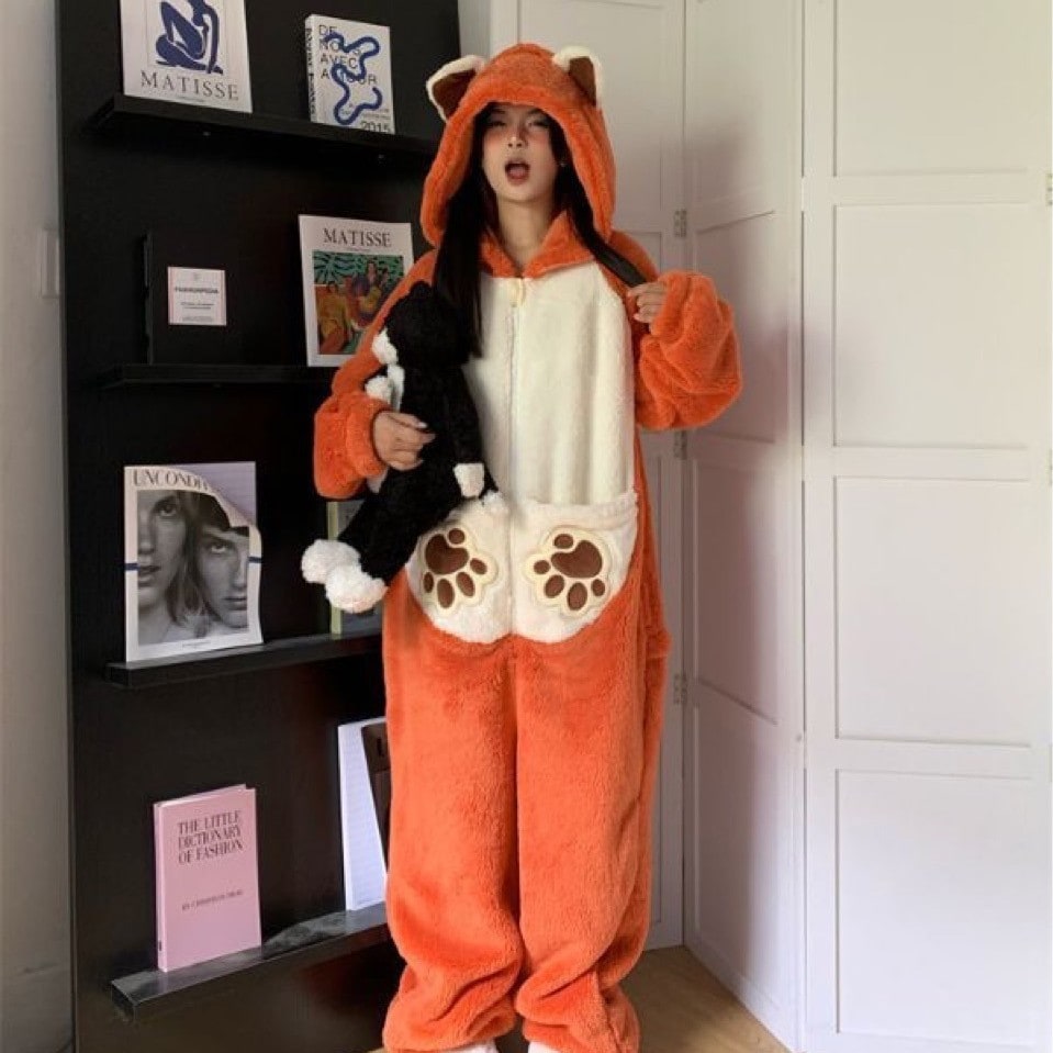 【人気商品】着ぐるみパジャマ フード付きパジャマ レディース秋冬用 コーラルフリース厚手 可愛いキツネ柄ワンピース ホームウェアセット