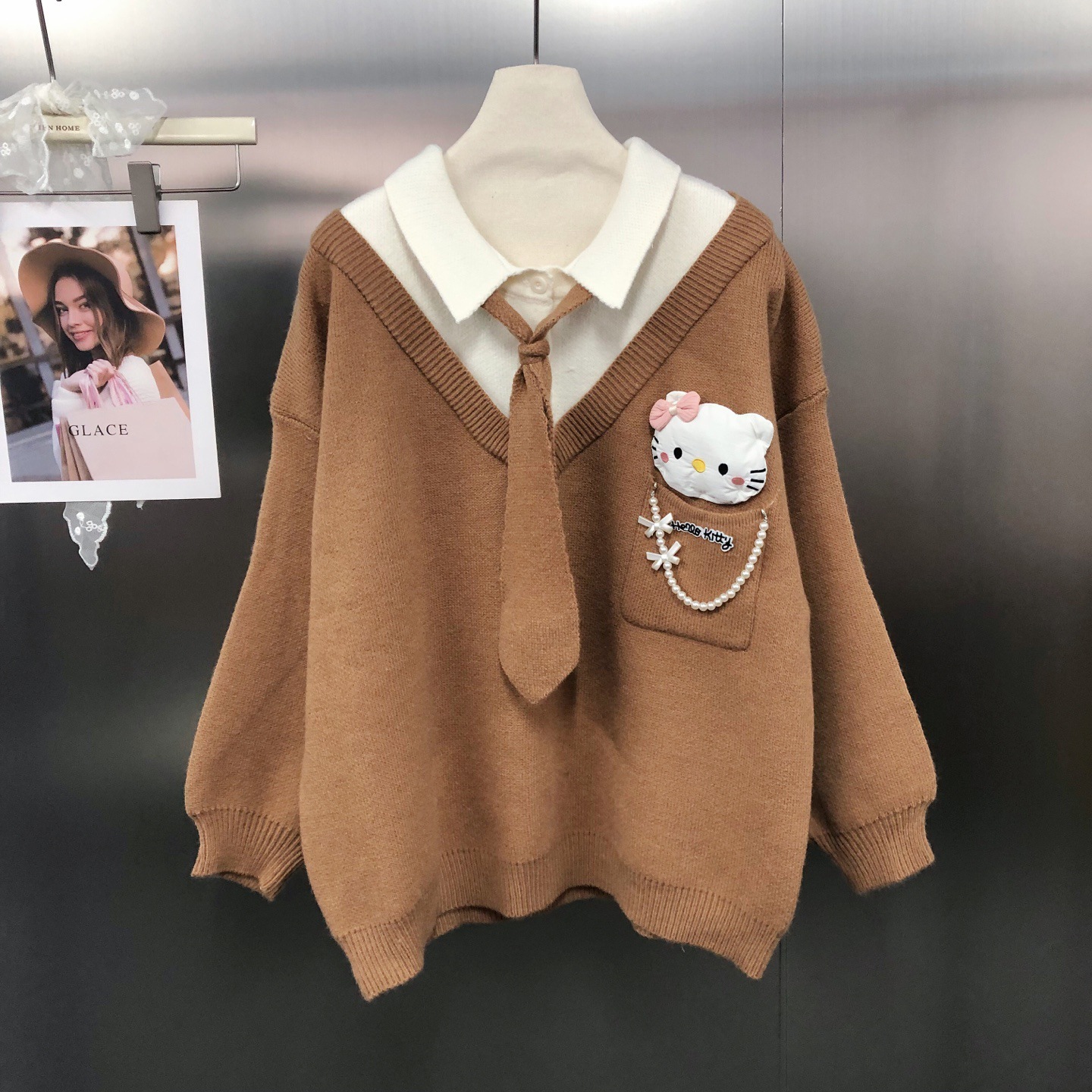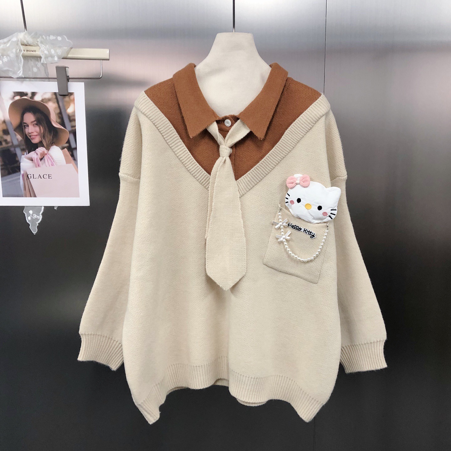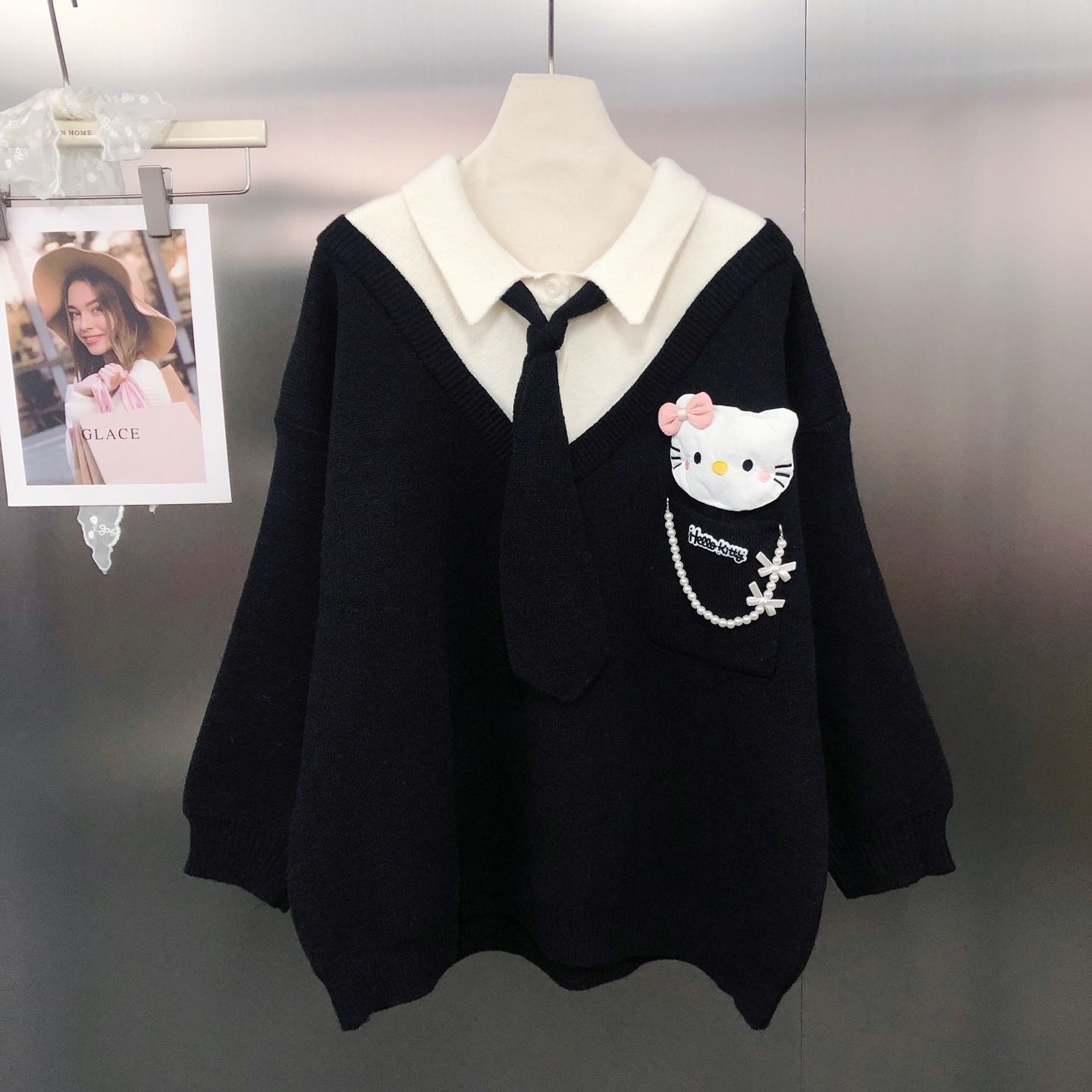 キティ スイート韓風 若返り効果 デザイン性あり リボン 学園風ソフトガール ネクタイ ルーズ カラーブロック セーター