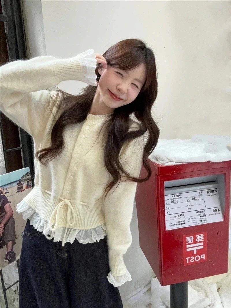 カーディガン レースパッチワークセーターレディースウエストニットカーディガンショートトップス カーディガン