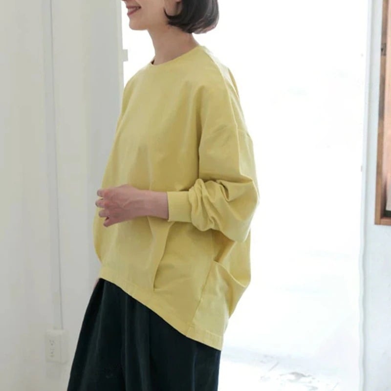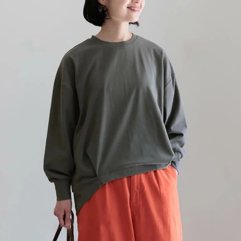 秋新作レディース純綿Tシャツ長袖トップス レディース ラウンドネック無地ゆったり裾デザイン感トップス Tシャツ 長袖