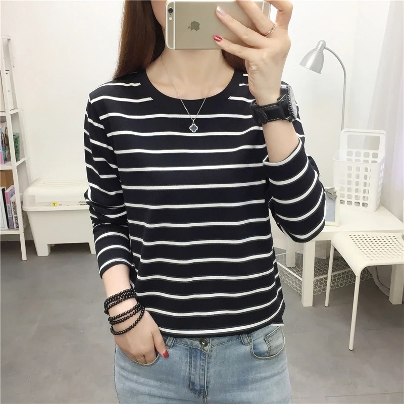 プラスサイズレディースゆったり長袖Tシャツ レディース 秋物純綿ストライプインナートップス tシャツ 長袖