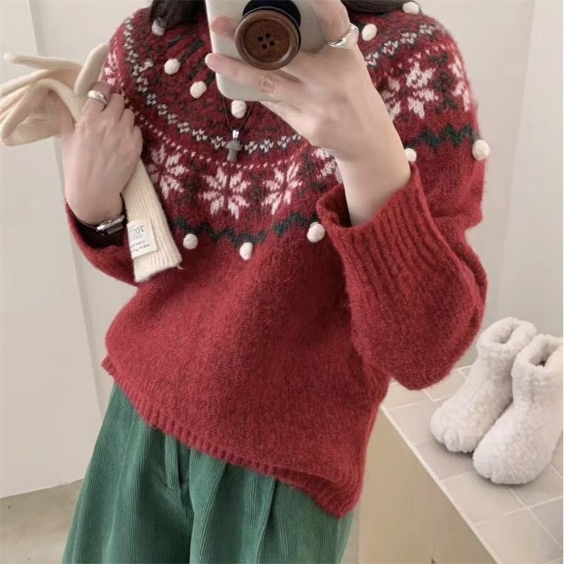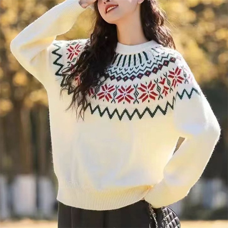 最安值に挑戰! サンタ コスプレ2025年秋冬新作ジャカード着やせニットプルオーバーレトロ百合気質だるい丸首セーター女 ニットセーター レディース クリスマス コスプレ