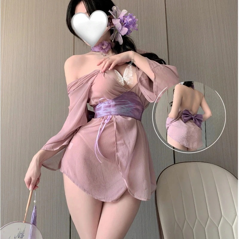 セクシー浴衣セット 紫の趣情趣下着人妻誘惑情趣漢服ワイド袖肩出し露出背セクシーパジャマガウン コスプレ セクシーランジェリー