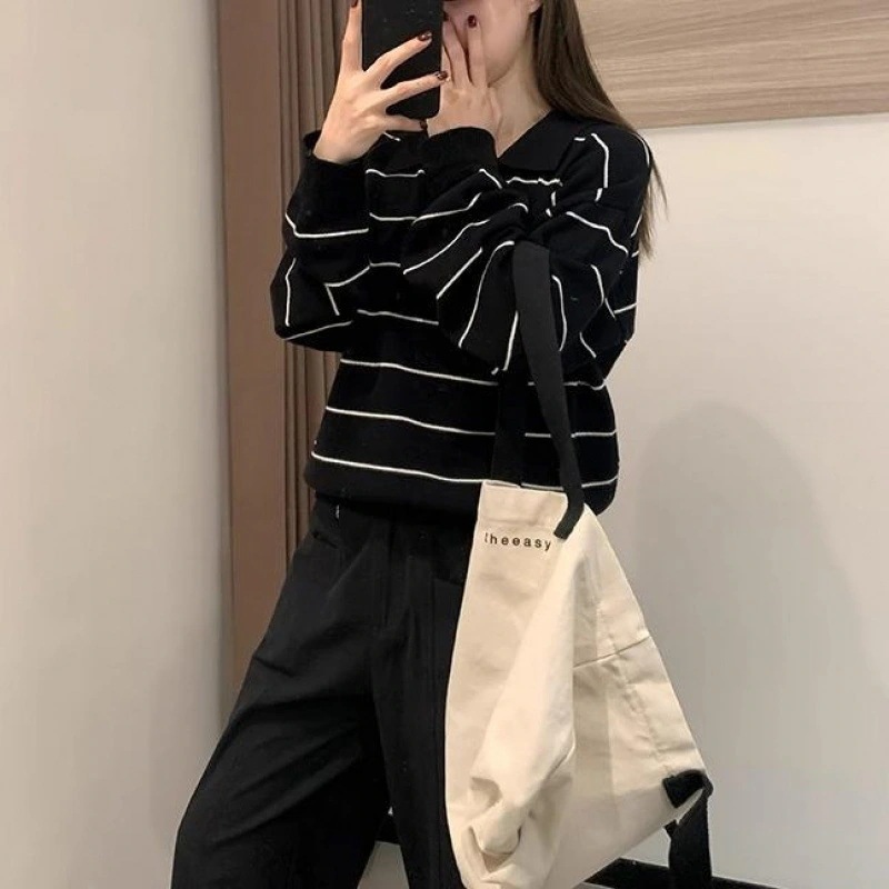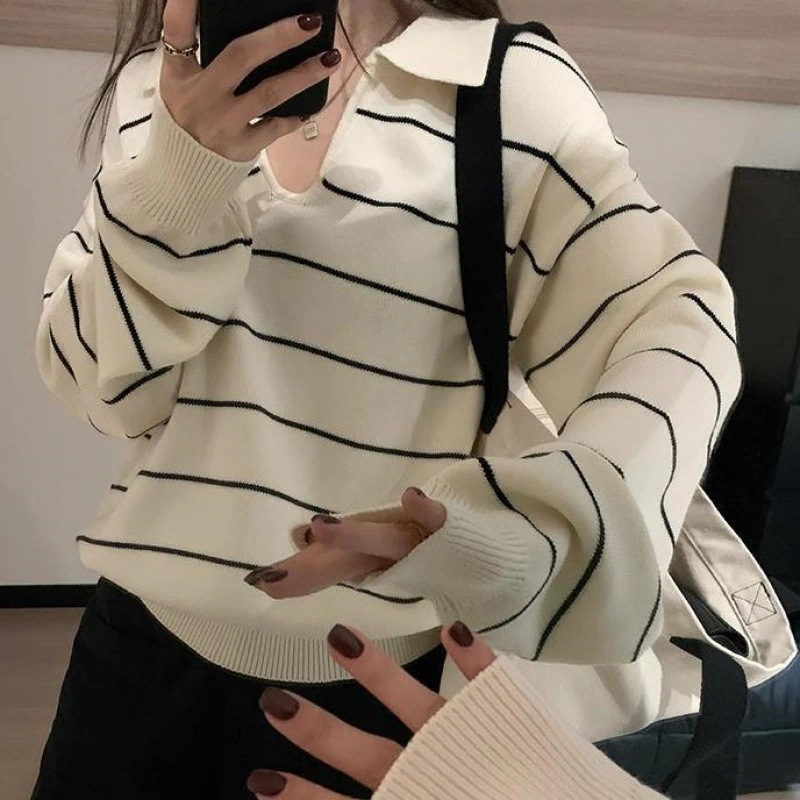 人気ニット ストライプポロネックプルオーバーニット2025秋冬新作デザイン感あるラフ風ベースレイヤーセーターベーシックニット